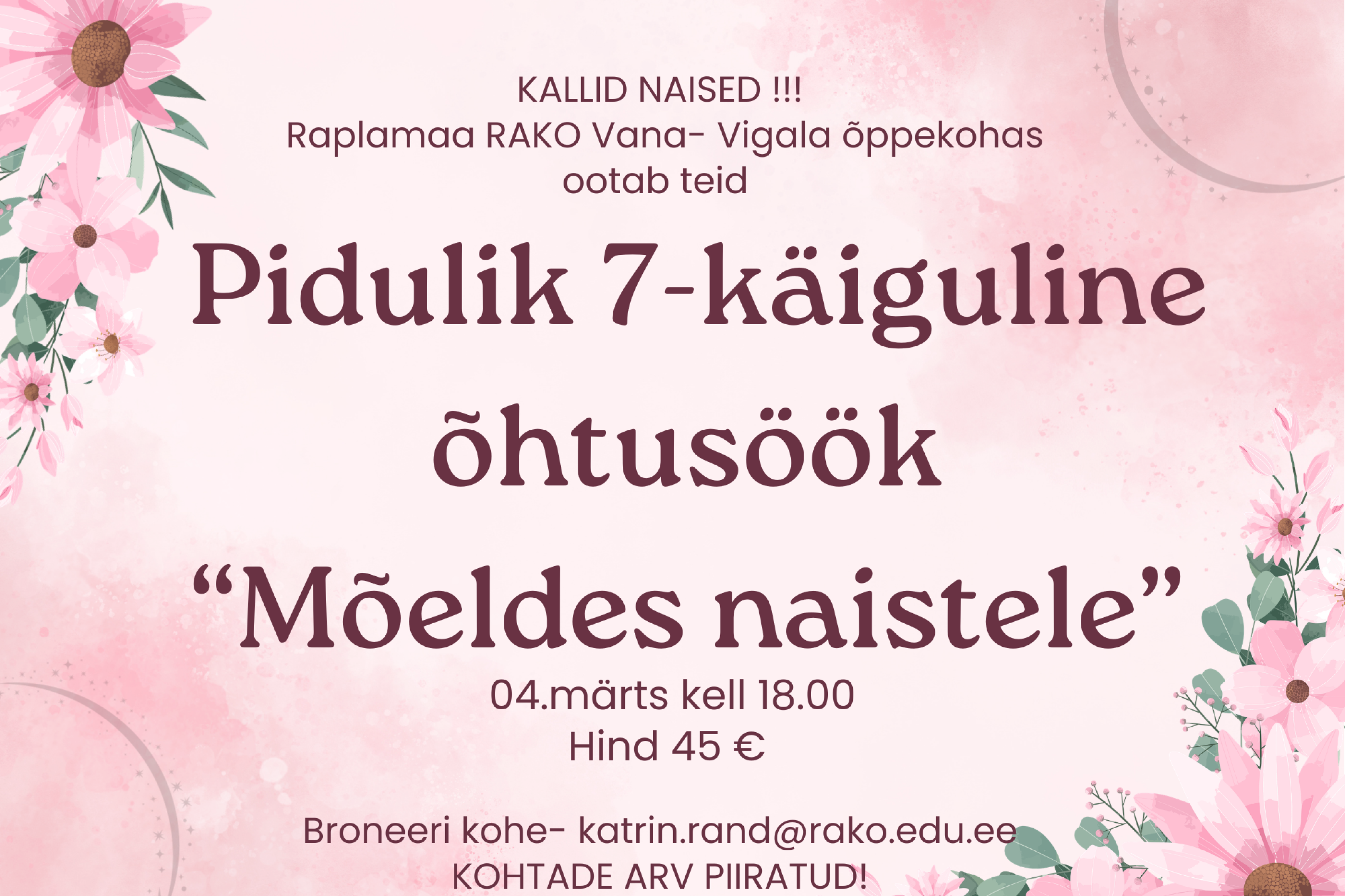 04.03 – veel on mõned vabad kohad, broneeri kiiresti ja tule naudi mõnusat atmosfääri ning maitseelamusi.