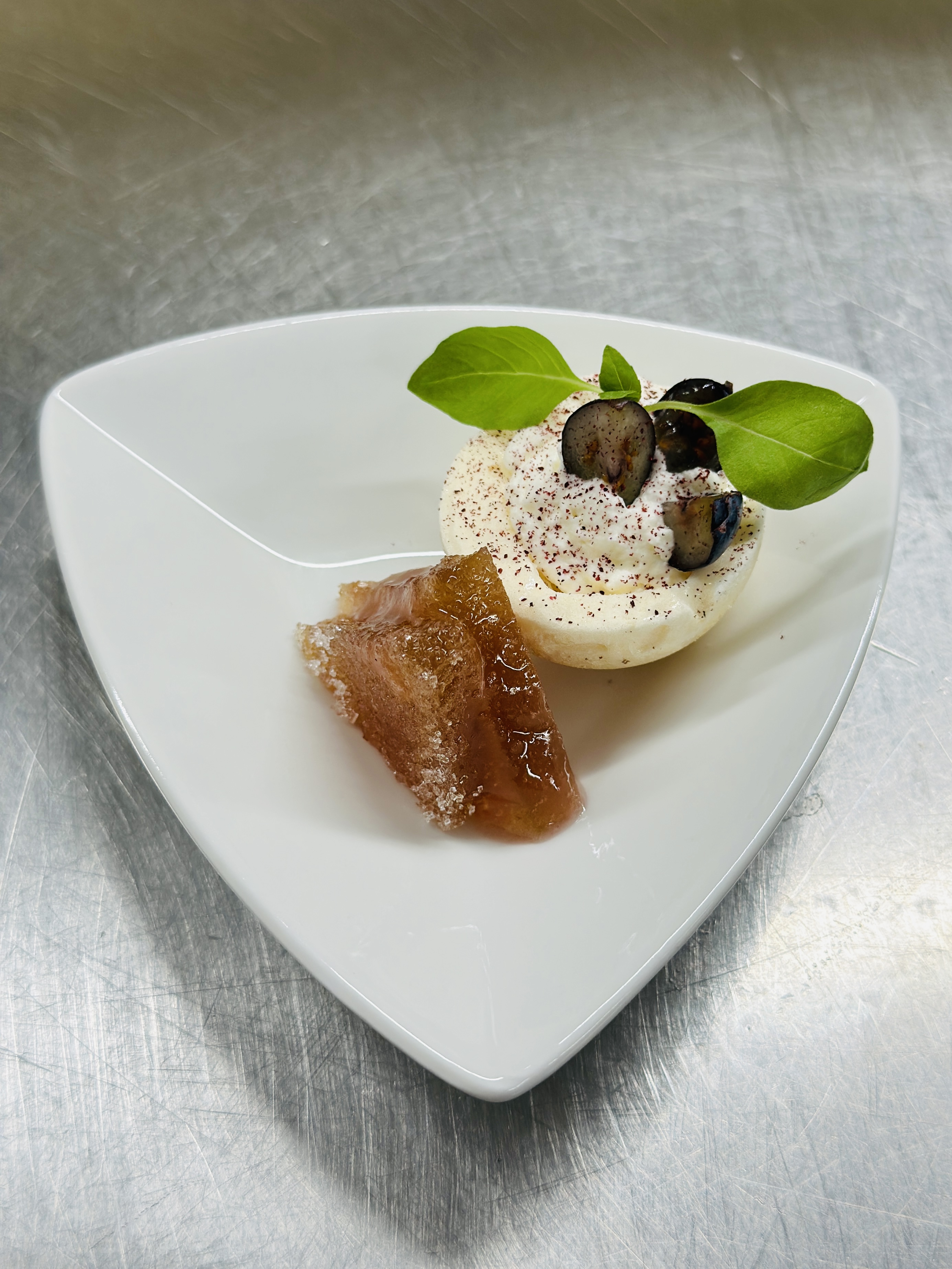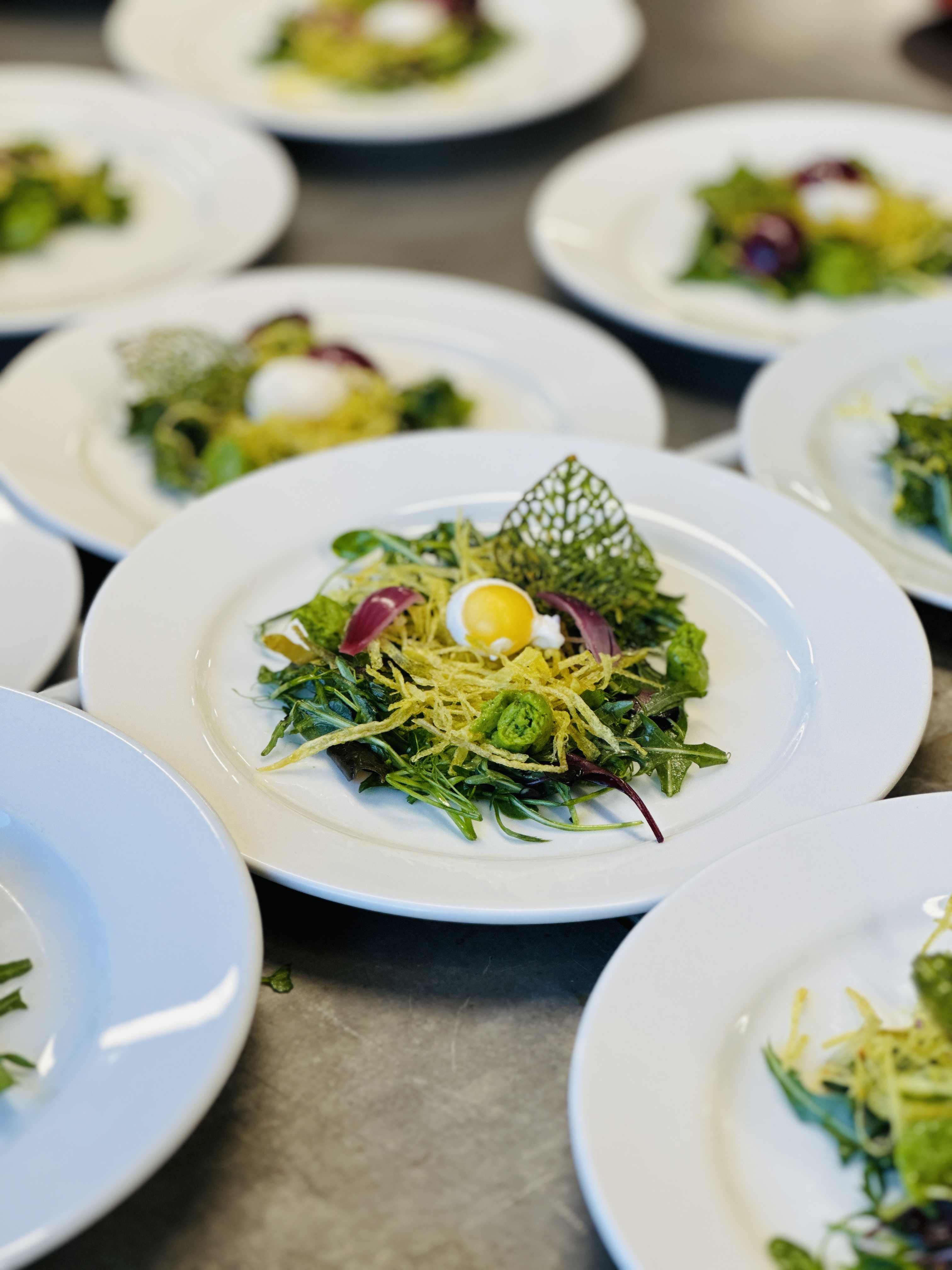 Esimeseks käiguks pakkusime rooga nimega “pesa punumise aeg”. Taldrikule oli serveeritud friteeritud kartulipesa koos pošeeritud vutimunaga. Selle all karulaugupestoga roheline salat, kergelt marineeritud punane sibul ning karulaugu