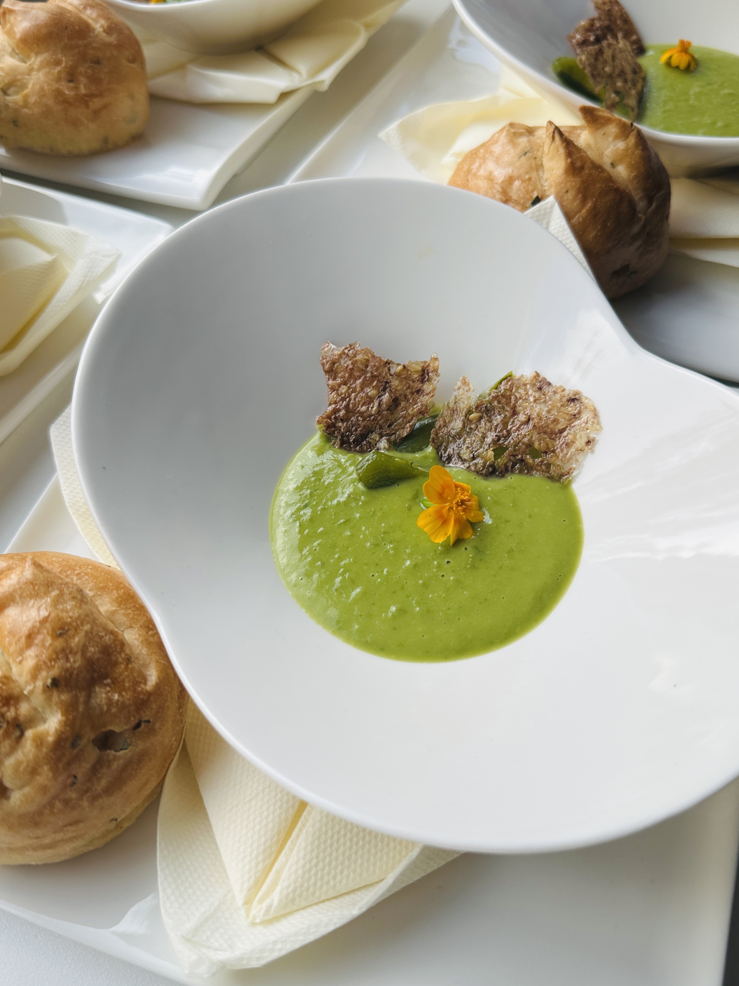Järgmiseks käigu nimeks sai “rohi on juba rohelisem”. Pakkusime rohelise herne kreemsuppi toortatrakrõpsu ja lesthernega. Sinna kõrvale tegime ürdise kukli, millest tähelepanelikud külalised tundsid ära jänku. Väikeseks vahepalaks esinesid teile meie koka eriala õpilased Hiie ja Kaur.