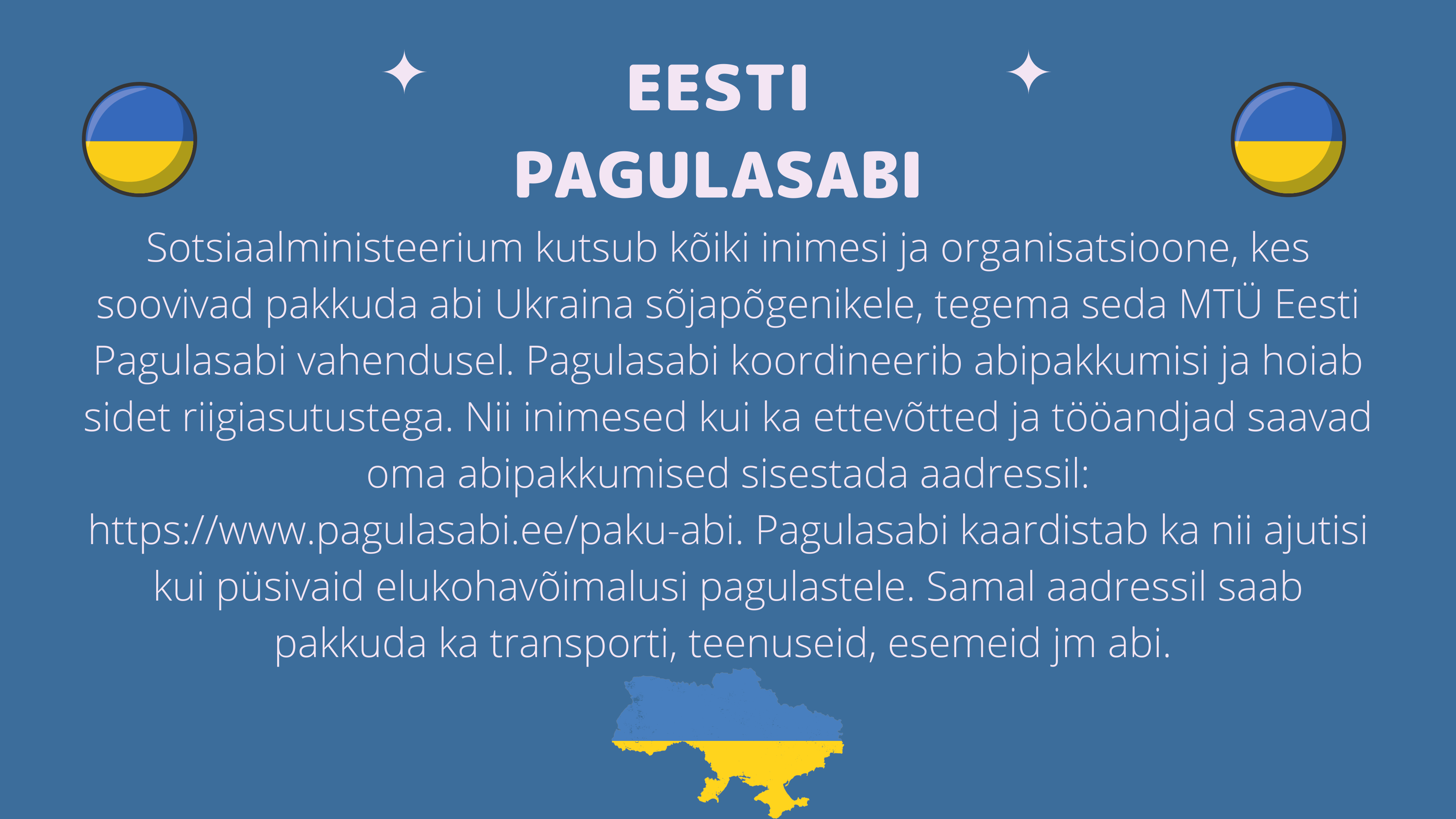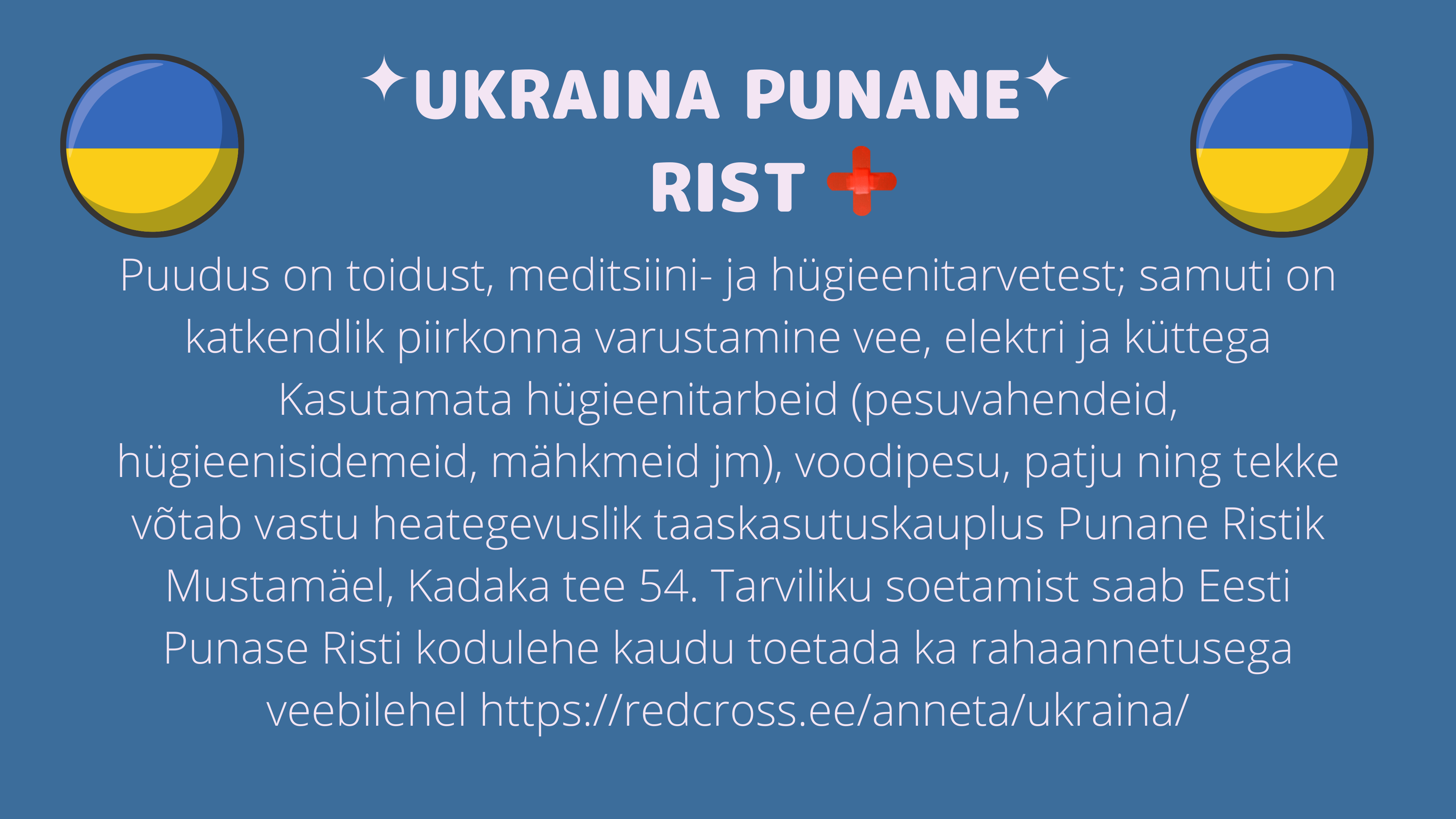 Seoses hetkel Ukrainas toimuva kriisiga on 01.-04.03.2022 võimalik tuua Vana-Vigala Tehnika- ja Teeninduskooli direktori kabinetti annetusi aitamaks Ukraina abivajajaid.