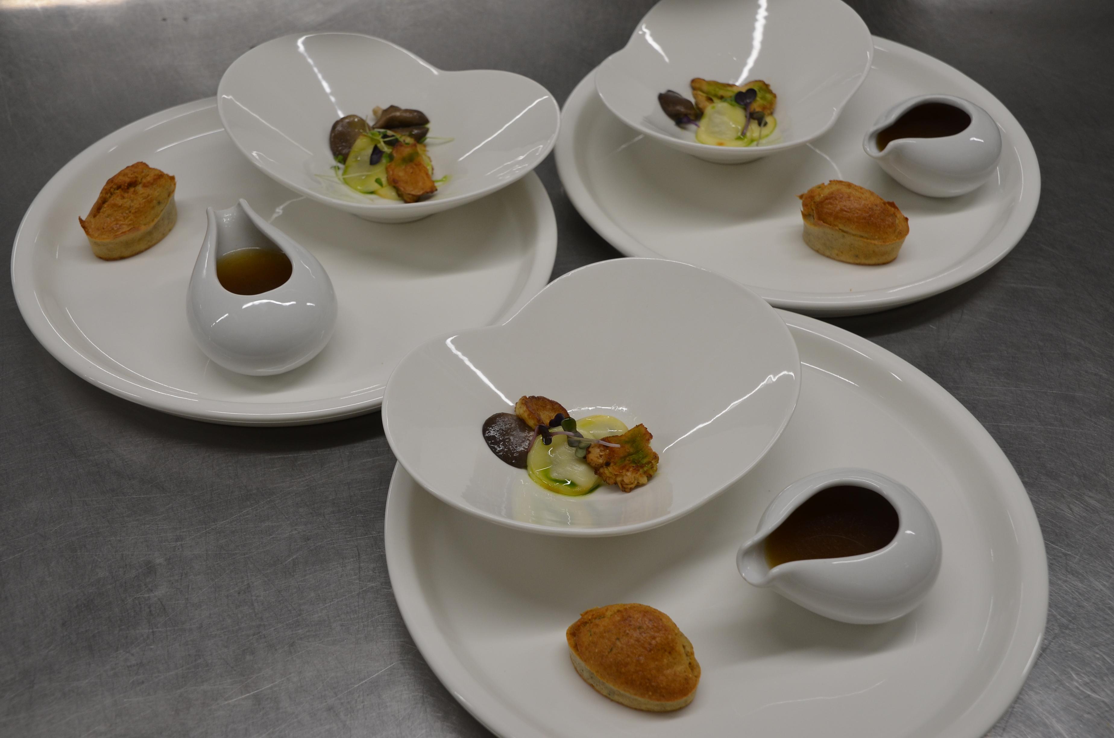 Seenekonsomme Kullamaa seente (marineeritud austerservikud, praetud lõvilakk) kadakajuusturavioolidega ja ürdikaraskiga