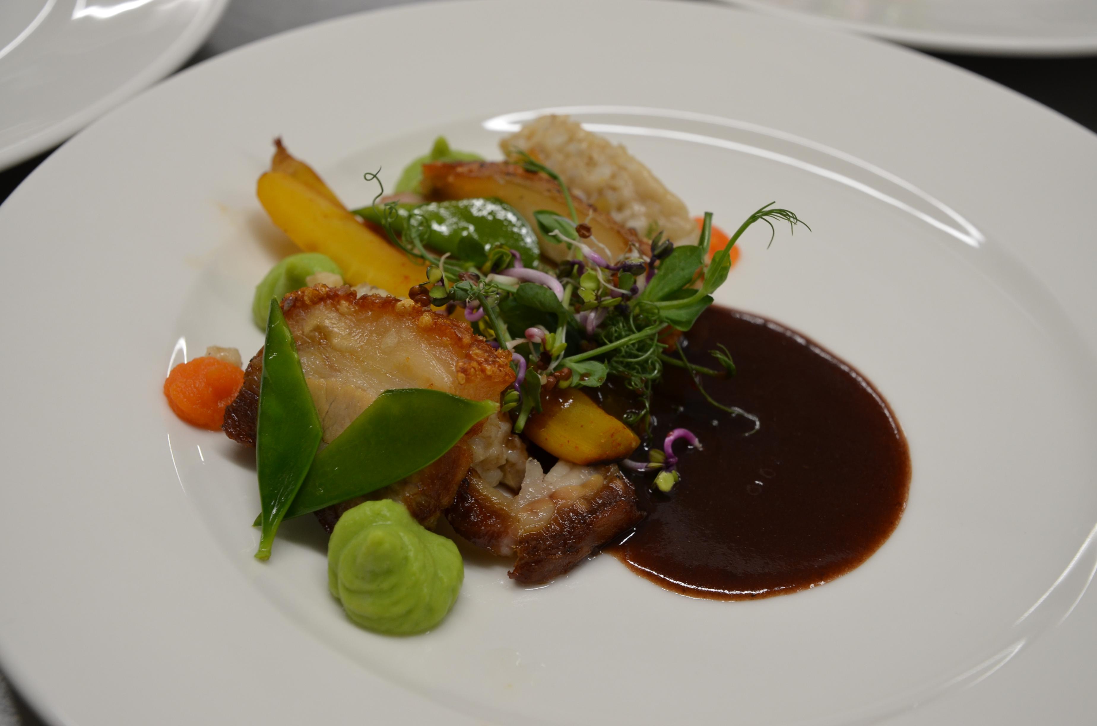 Aeglaselt küpsetatud seakülg krõbedakamaraga, krubotto, suitsutatud porgandid, mustsõstrakaste, hernepüree ja lesthernes