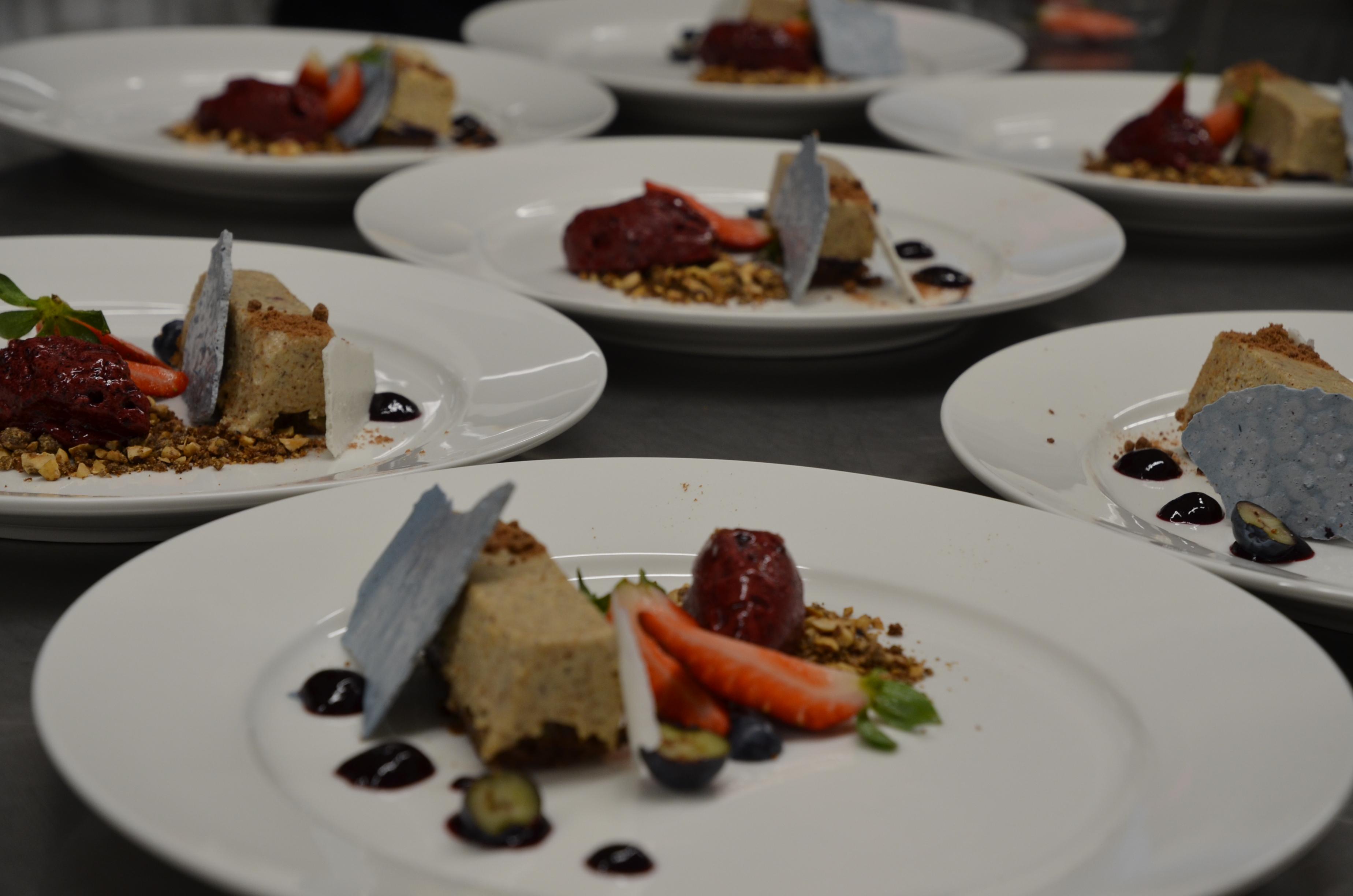 Kamakreem pähklibiskviidil mustika-jäätise, mustikageeli, kama-mustika besee ja kama-pähklipralineega