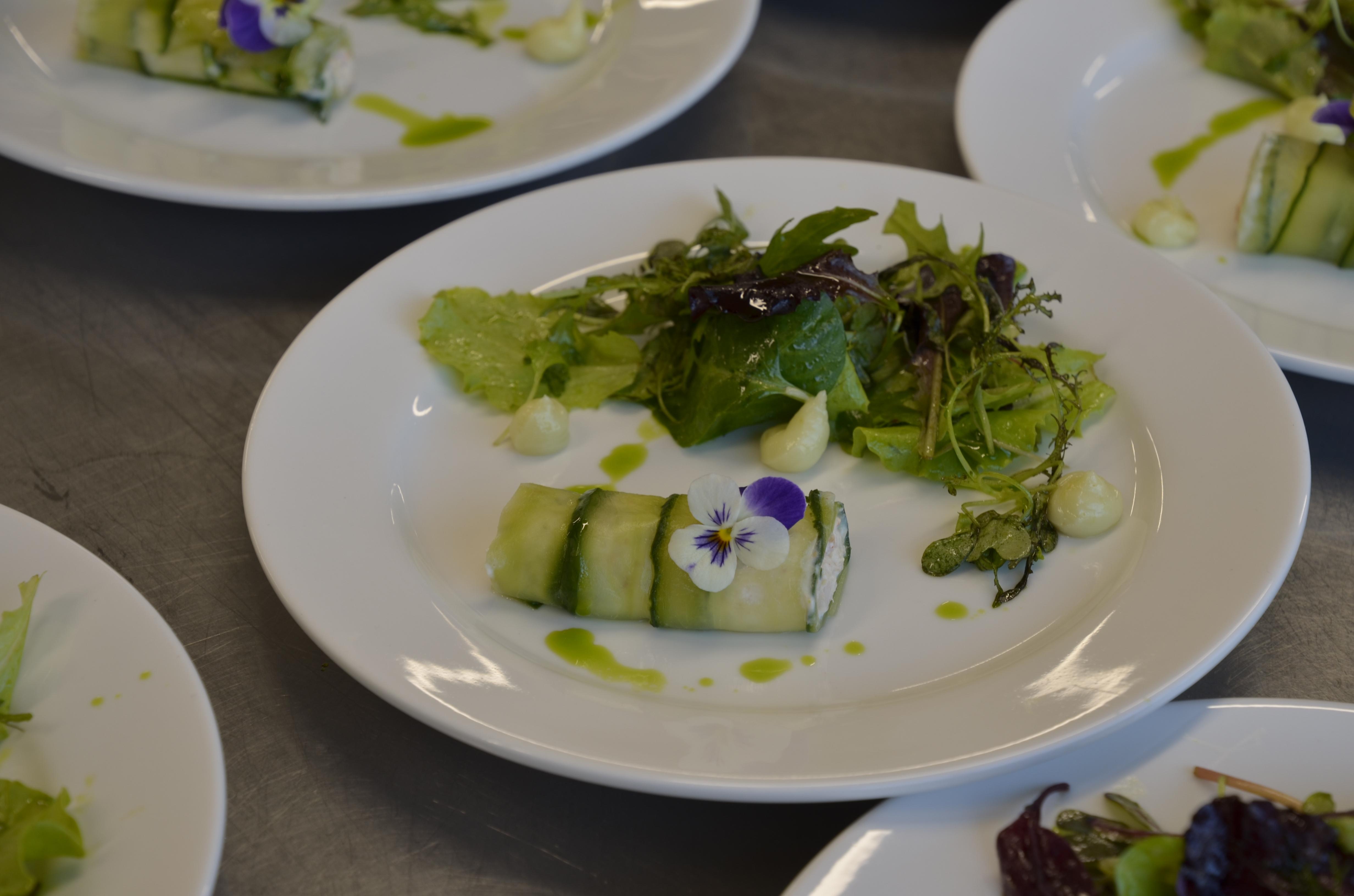Kergelt marineeritud kurgirull toorjuustu–vähi täidisega, värske salat (rukola, mikrovõrsed, naat), küüslaugumajonees