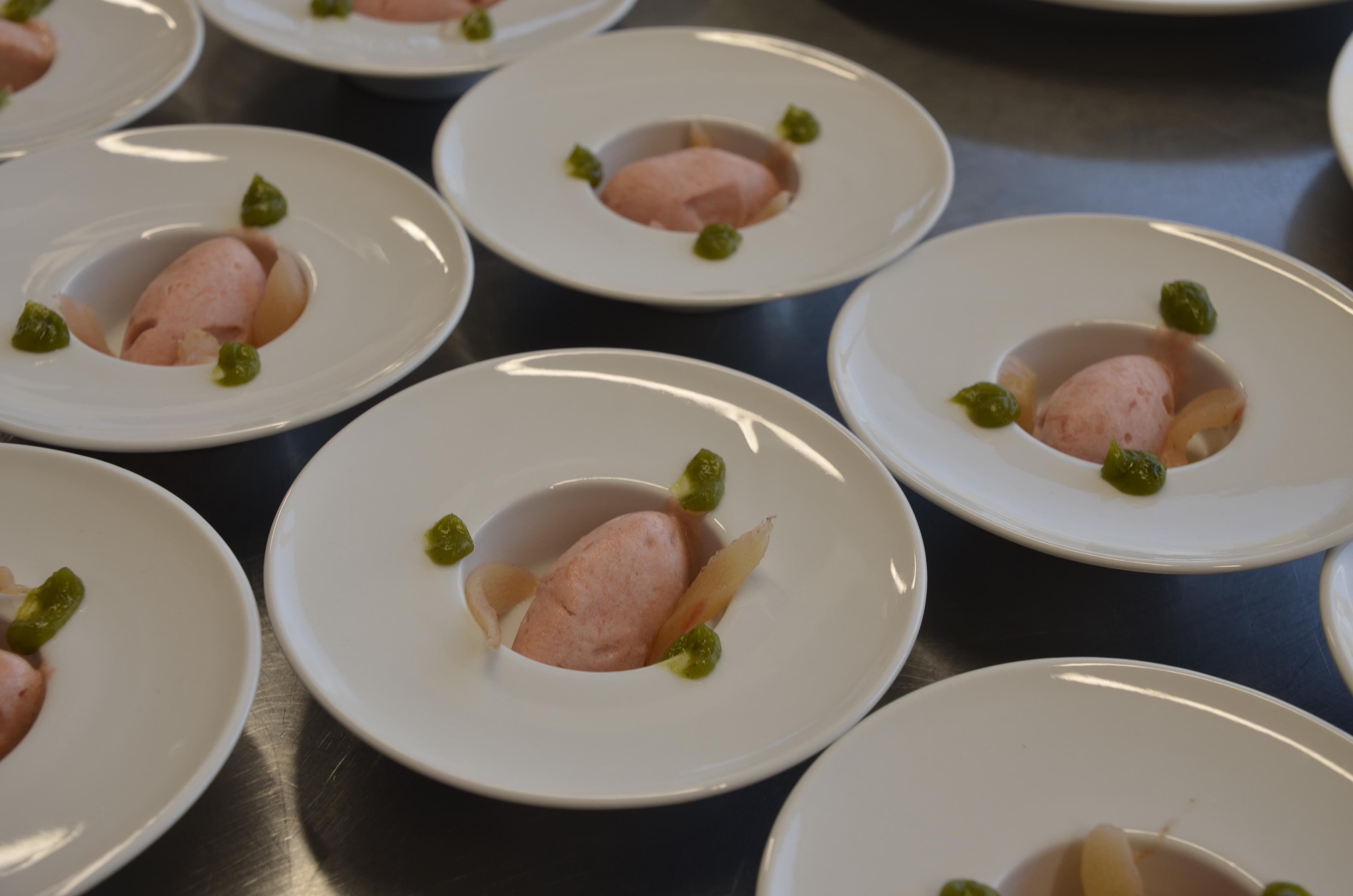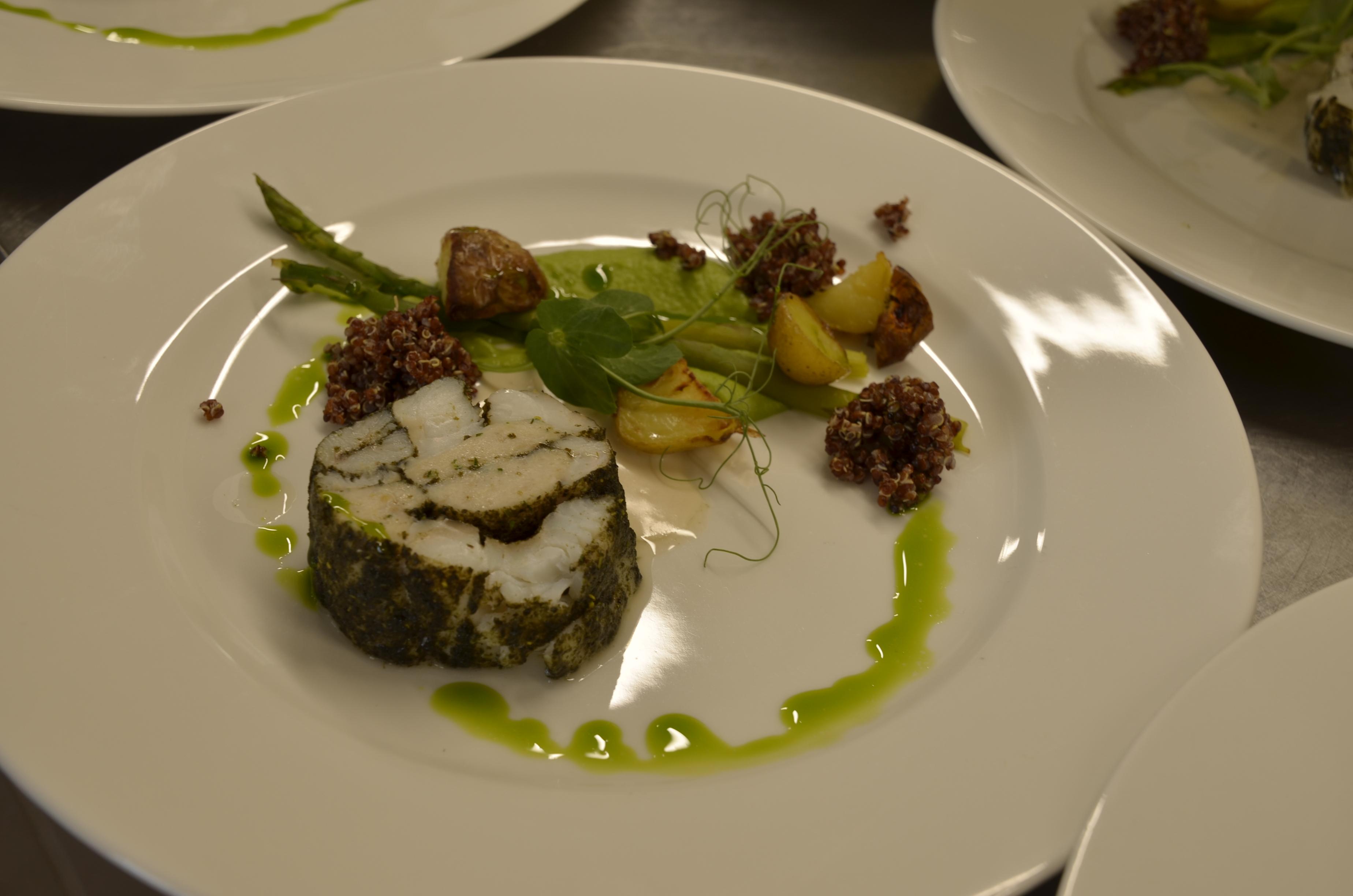 Madaltemperatuuril küpsetatud ahvena ja haugi mosaiik, röstitud värske kartul, spargel, punane kinoa, hernekreem ning koore-sidrunheinakaste