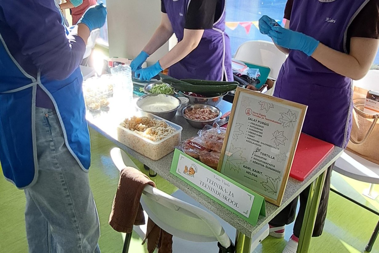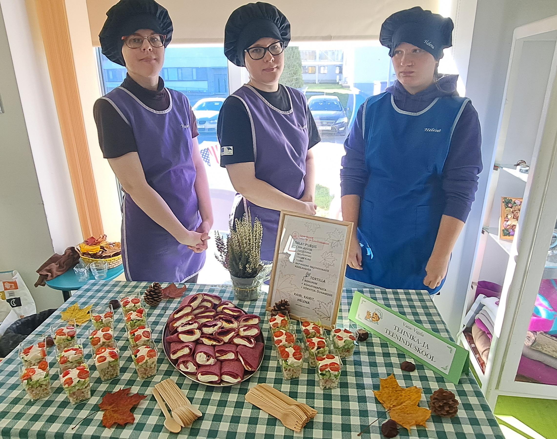 Meie kooli esindas 3 köögiabilist: Kairi ja Kairit 2. kursuselt ja Helena 1. kursuselt. Õpilasi juhendas toitlustusosakonna kutseõpetaja Laivi Hints. Soolaseks ampsuks pakuti kihilist salatit, mis serveeriti purgis. Magusaks suupisteks oli kohupiima ja kõrvitsa-õunamoosiga täidetud tortilla, mis on hea kaasa haarata taaskasutust vajavas tühjas mahlapakis.