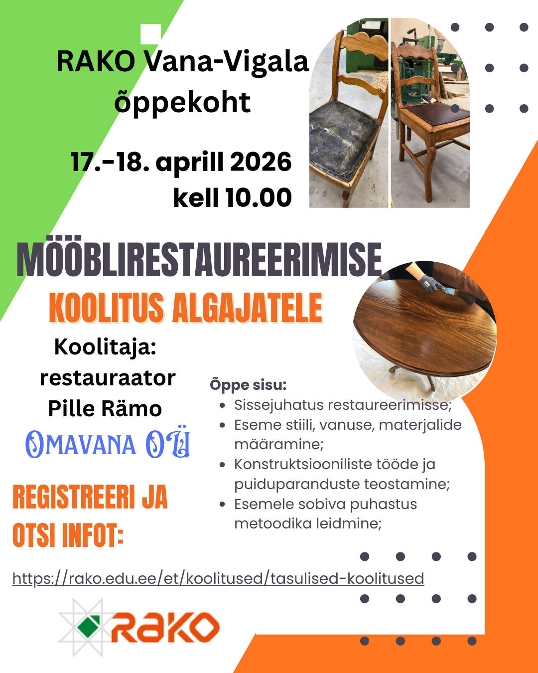 17.–18. aprillil 2026 toimub RAKO Vana-Vigala õppekohas mööblirestaureerimise koolitus algajatele, mille eesmärk on anda osalejatele praktilised teadmised ja oskused mööbliesemete taastamiseks ja hooldamiseks.