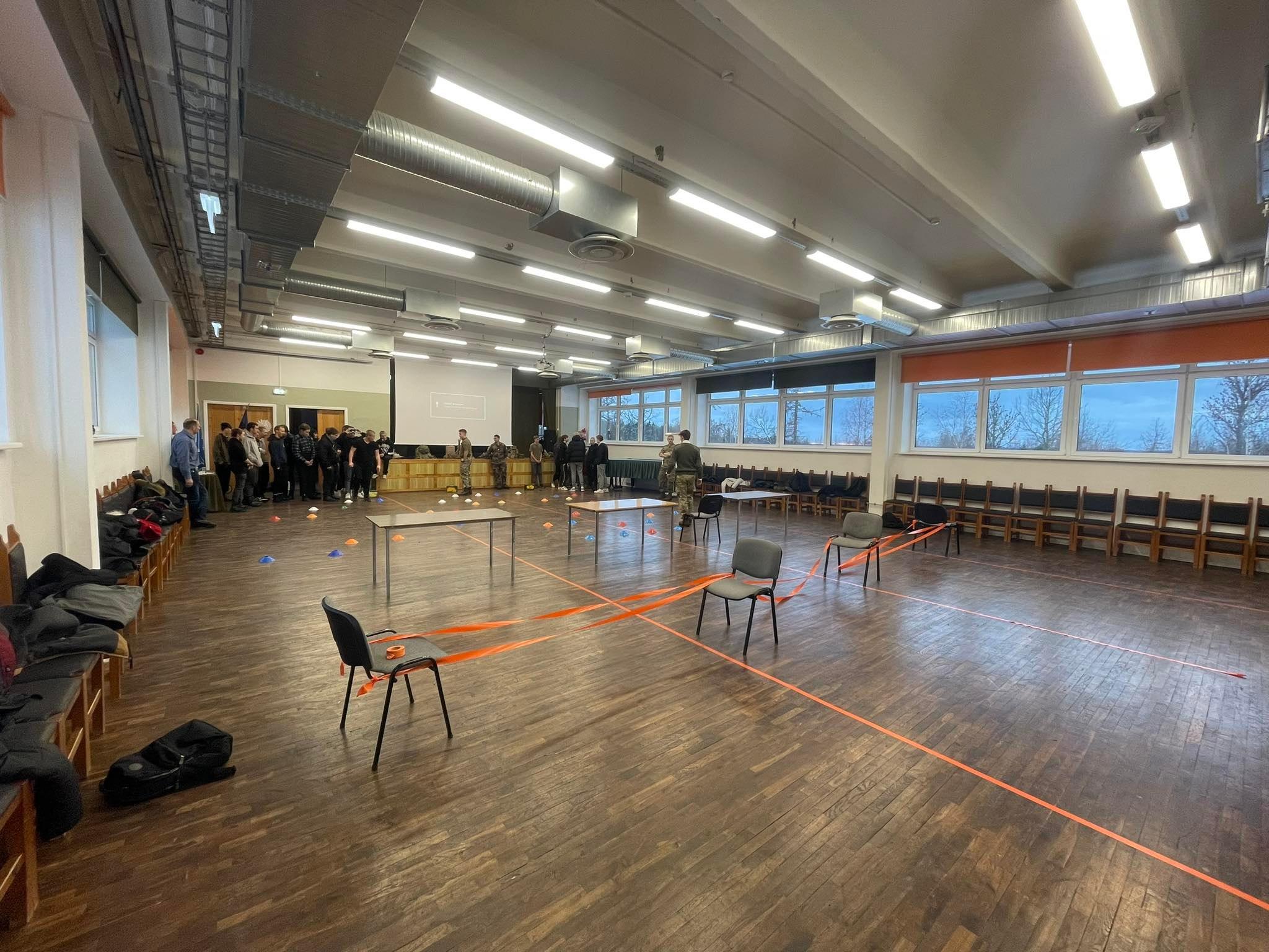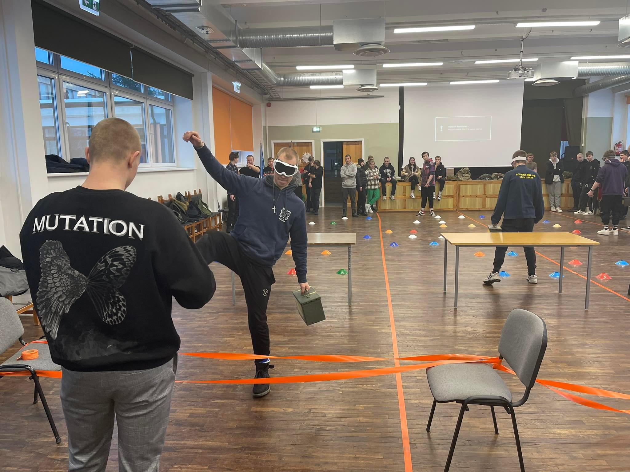 Esmalt võtsime külalised vastu suurepärase lõunaga, mille olid valmistanud meie kooli kokandusosakond. Toidud maitsesid väga hästi - arvestades, et külalised ei söö tavaliselt kõiki Eestis valmistatud roogasid. Siis suundusime aulasse, kus leidis aset esitlus NATO ning liitlasvägede Eestis resideerumise kohta. Muidugi tutvustasid kõik külalised ennast - mis auastmes nad on ja kui pikalt viibivad Eestis (Tapa sõjaväebaasis). Seejärel tehti Kahoot mäng kõigile õpilastele kasutades mobiiltelefone, mille küsimused olid seotud Eesti osalusega NATO- s ja liitlasvägede viibimisega Eestis. Kokku oli 20 küsimust. Mõned õpilased olid eriti nutikad, sest eksisid ainult mõne vastusega. Tehti väikene paus ja siis valmistasid külalissõdurid aulas ette takistusraja. Takistusrada kujutas endast miinivälja (alt ning ülevalt läbitavaid takistusi). Kokku oli kolm rada, kus korraga toimus läbimine nii, et üks õpilane pani ette pimendavad prillid ning teine õpilane juhendas teda. Kui astuti miinile või takistusele, siis pidi astuma ühe sammu tagasi. Ülesanne tekitas õpilastes palju elevust.