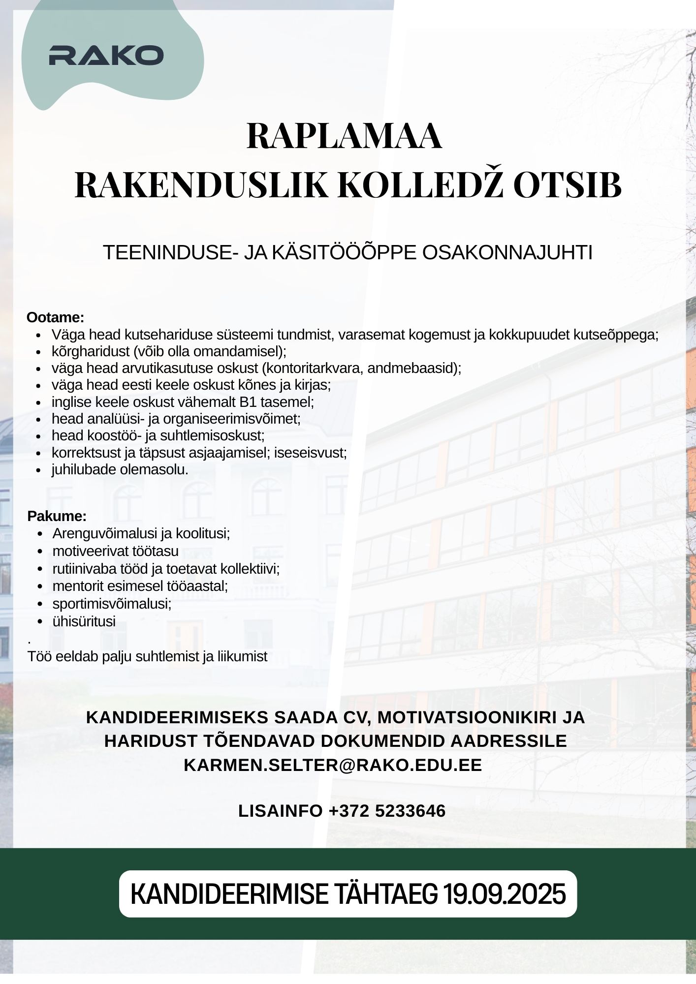 Kandideerimiseks palume saata CV, motivatsioonikiri ja haridust tõendavad dokumendid e-postile karmen.selter@rako.edu.eelink opens on new page.