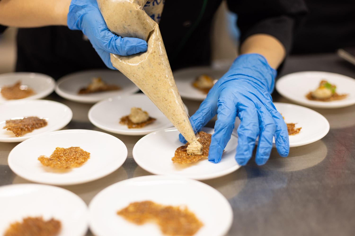 Tervitusampsu nimeks sai menüüs “Ah… sõida seenele! No käisimegi… ja Tõrvaaugu talu tatrapõllul ka." Ei saanud jätta kummardust tegemata Tõrvaaugu talule, sest see on praegu meie kandi kõige suurem ja tuntum tootja. Pakkusime tooratatratangust keedetud ja friteeritud õhikut, millele serveerisime puravikuga vahu, praetud kukeseene ja astelpajugeeli ning sinepilehega.