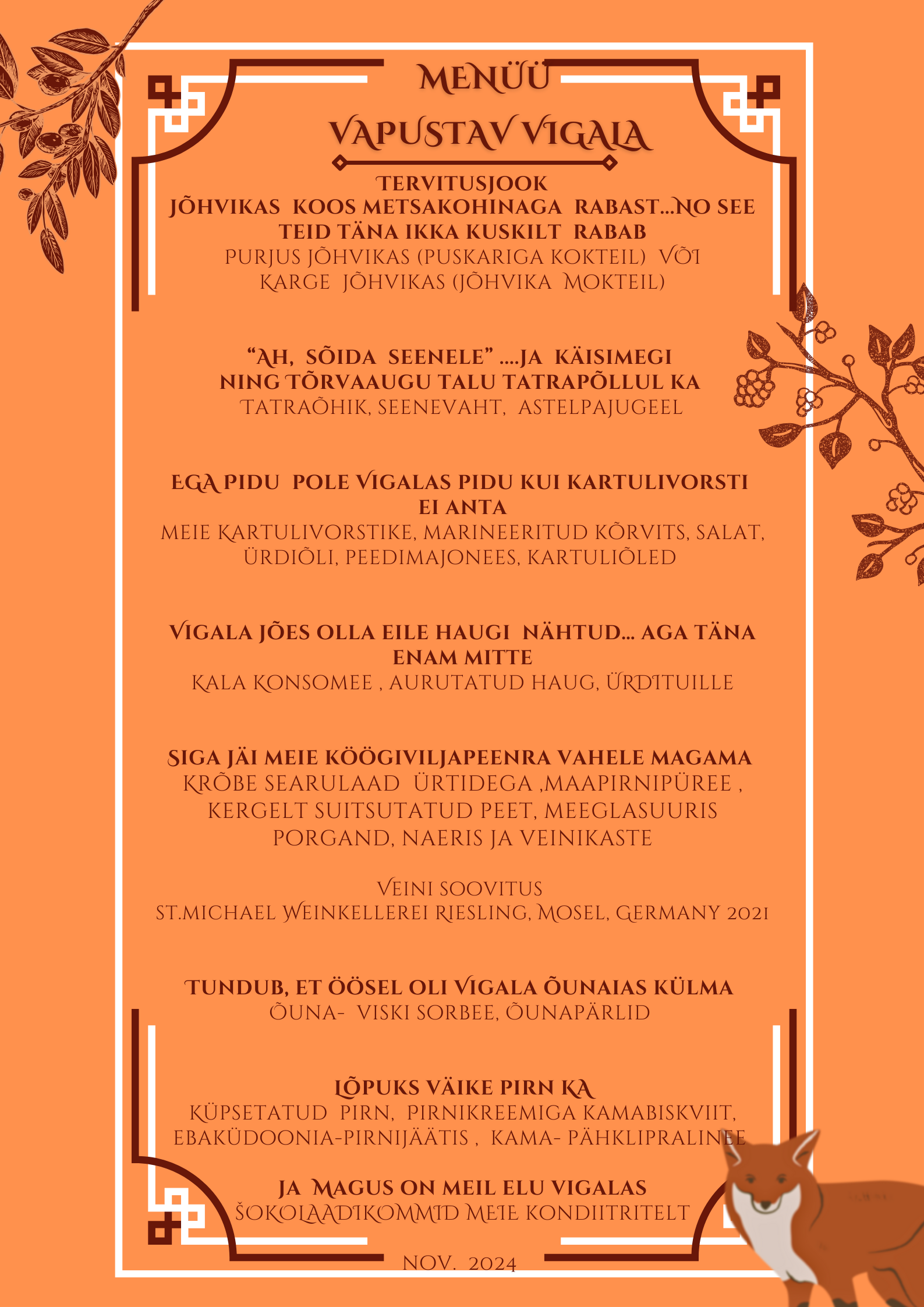 6. ja 7. novembril toimusid Vana-Vigala Tehnika- ja Teeninduskoolis järjekordsed restoraniõhtud. Seekord oli õhtusöökide teemaks “Vapustav Vigala”. Menüü jaoks oli inspiratsiooni saadud Vigala toidu ajaloost, loodusest ja kohalikust toorainest. Teenindajad kandsid Vigala rahvariideid.