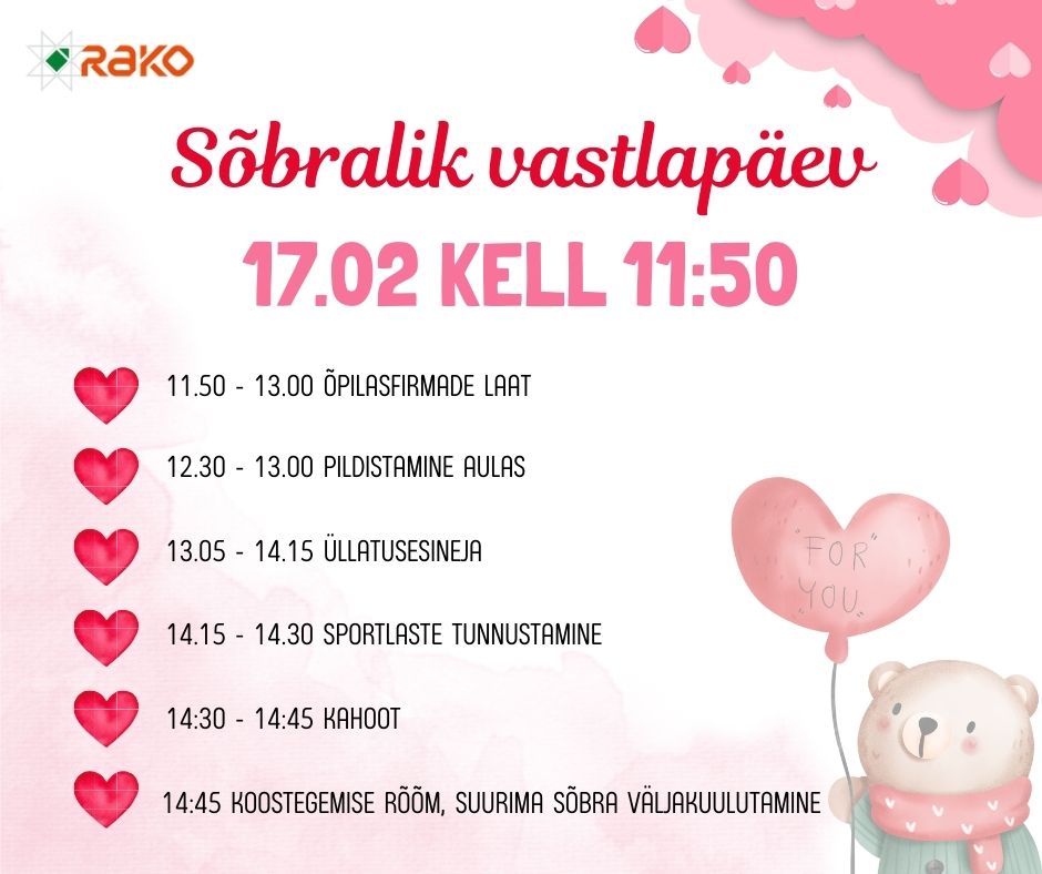 Hea õpilane ja õpetaja! Saame 17. veebruaril kell 11:50 peamajas kokku, et veeta koos üks rõõmus ja sõbralik päev täis tegevusi:
