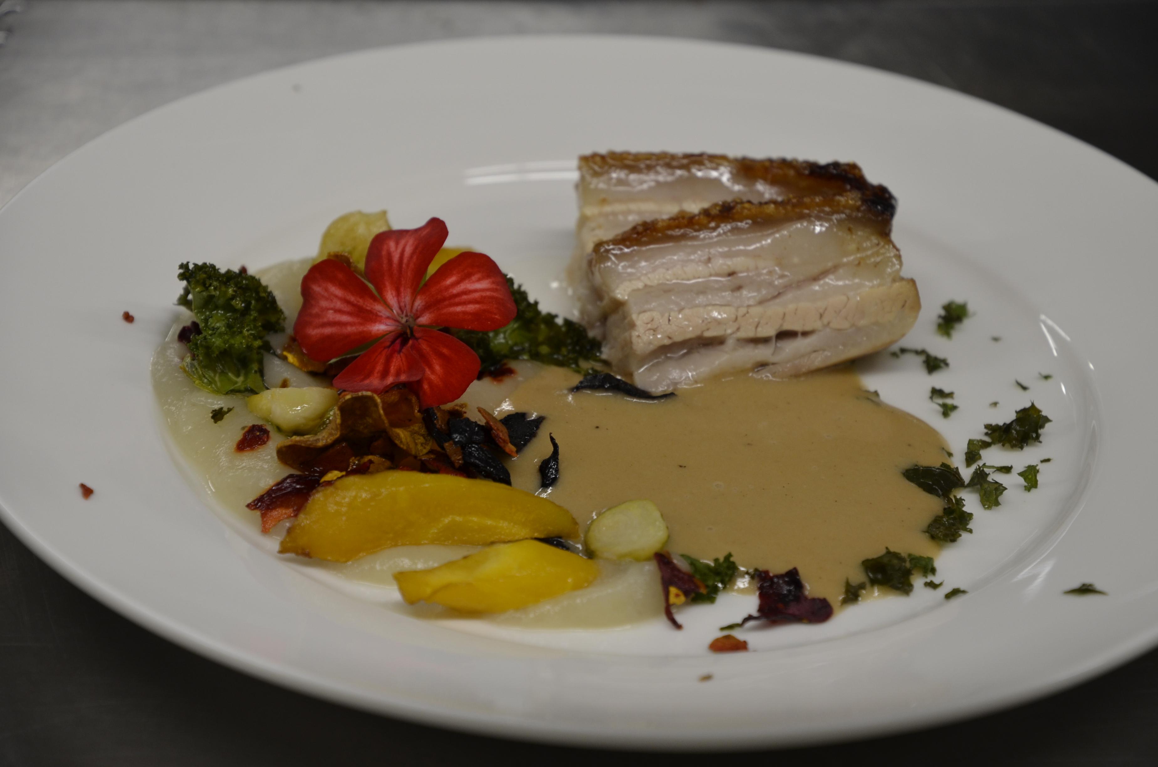 HIINAPÄRANE KRÕBEDA NAHAGA SEAKÜLG MAAPIRNIKREEMI, KÜPSETATUD PORGANDITE, KÕRVETATUD BRÜSSELI KAPSA JA KASTMEGA