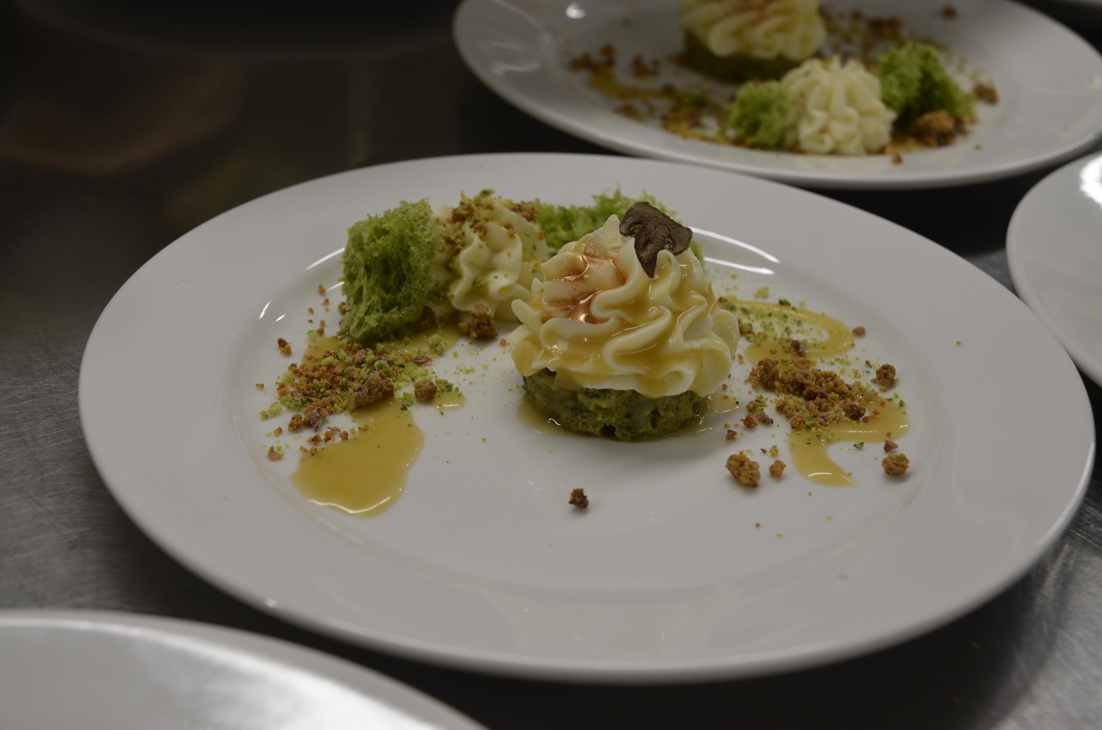 SPINATIBISKBIIT MASCARPONE-IRISEKREEMI, KARAMELLISTATUD SEENTE JA VALGE ŠOKOLAADIGA