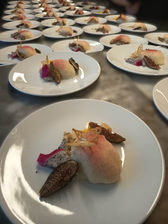 Magusa käiguga olime veel munadepüha lainel. Pakkusime pashast idee saanud aprikoositäidisega kohupiimakreemi valge šokolaadikattega. Sinna kõrvale eksootilisi puuvilju: meega küpsetatud viigimarju, mangot ja phitayat ning lisaks pähklipralineed. Käigu nimeks sai „Elu on magus“.
