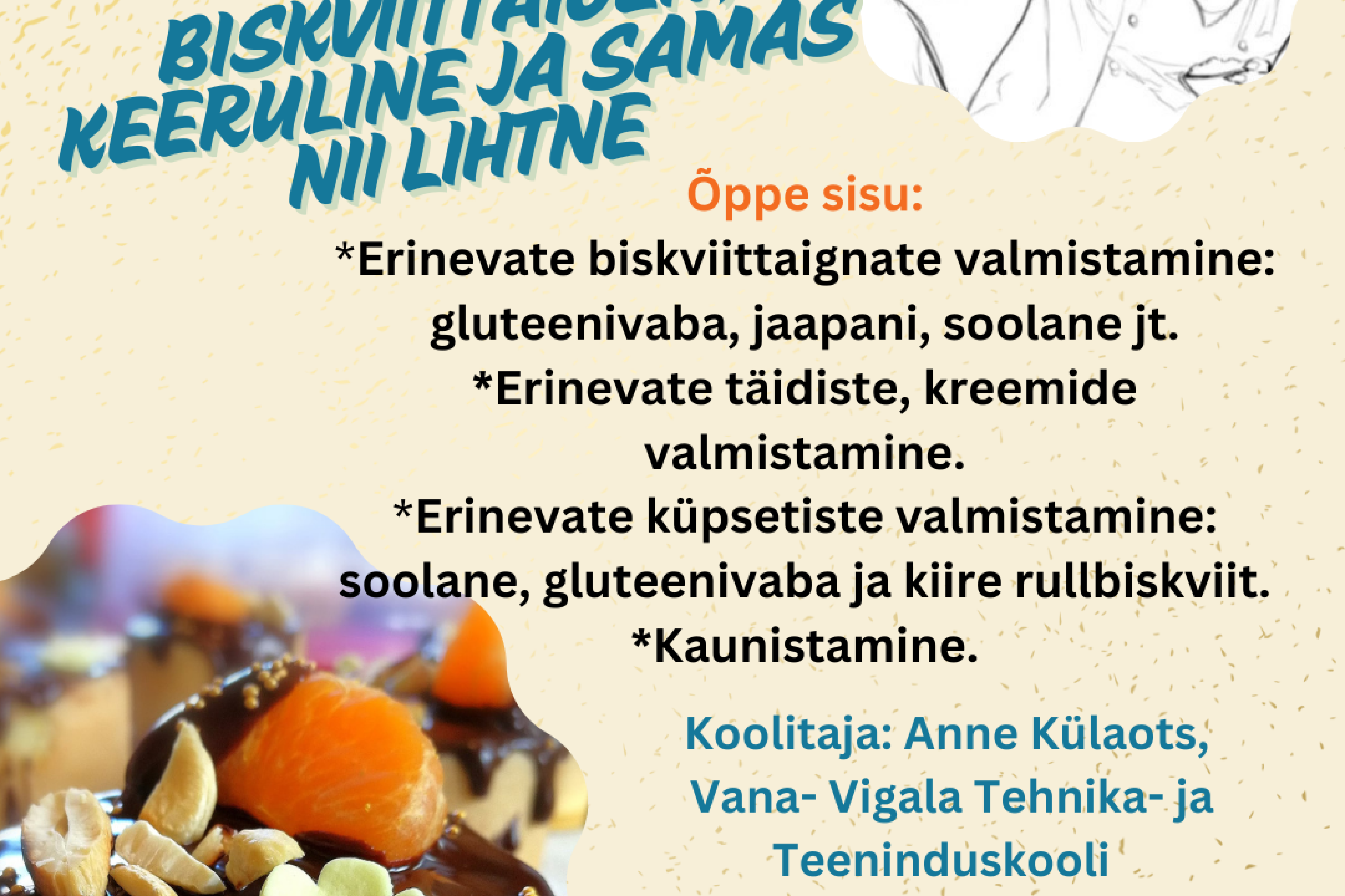 - Erinevate küpsetiste valmistamine.: soolane, gluteenivaba ja kiire rullbiskviit, kookosekook jaapani biskviidil, kohupiimakook biskviitpõhjal, rulltort.