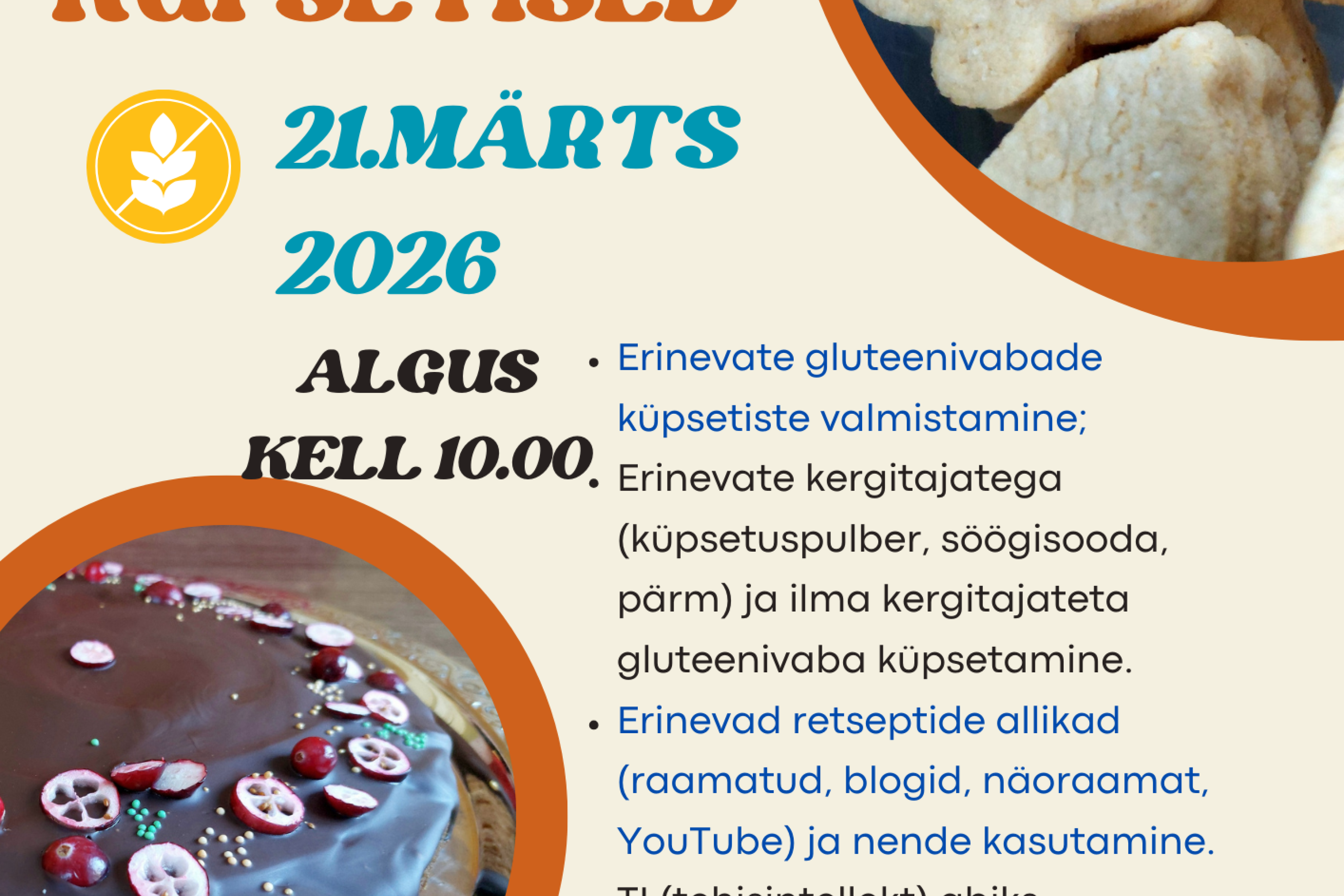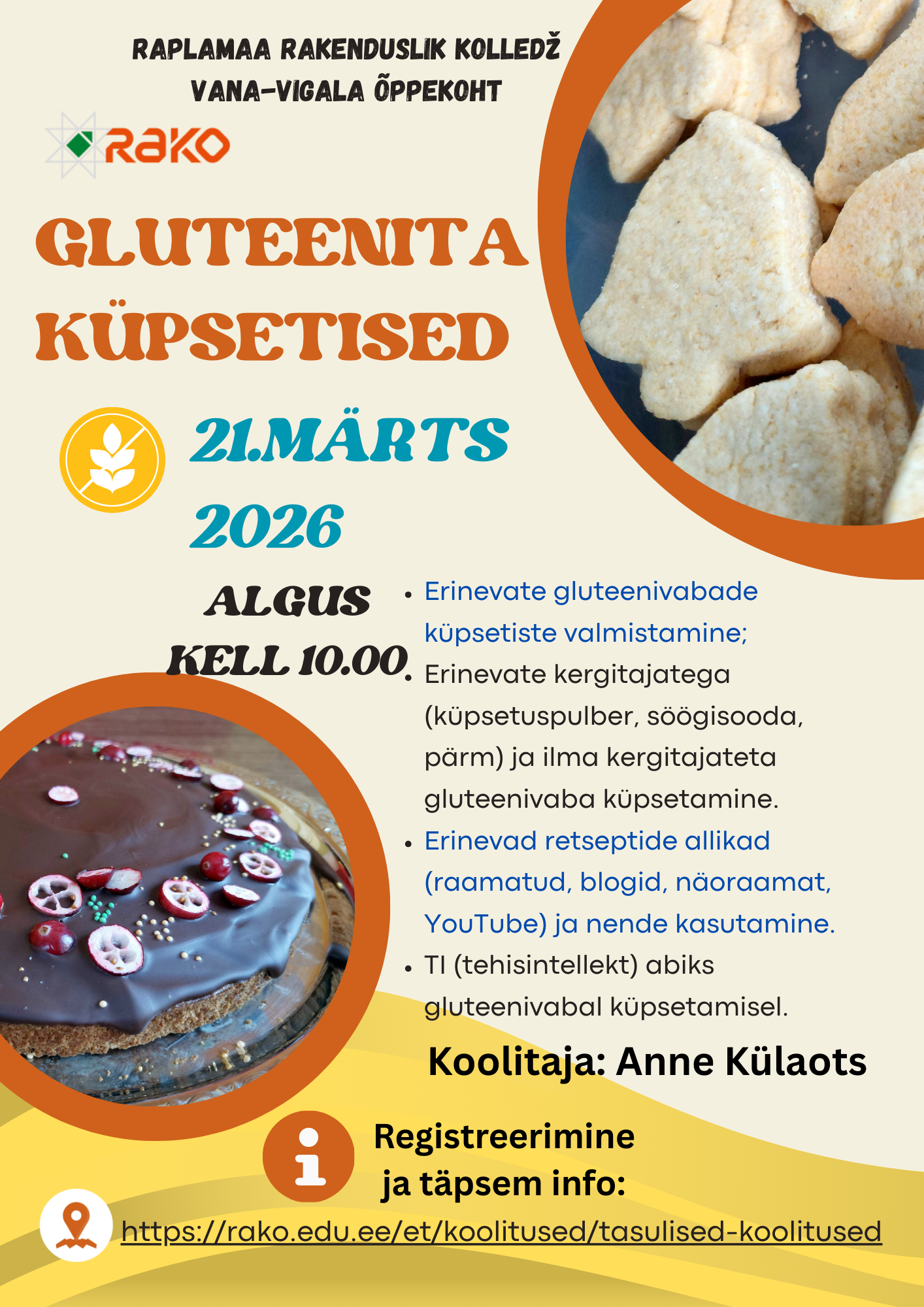 21. märtsil 2026 kell 10.00 toimub Vana-Vigala õppekohas praktiline koolitus „Gluteenita küpsetised“. Koolitusel valmistatakse erinevaid gluteenivabu küpsetisi, tutvutakse erinevate kergitajate kasutamisega ning vaadeldakse retseptide allikaid ja tehisintellekti kasutamist küpsetamisel.