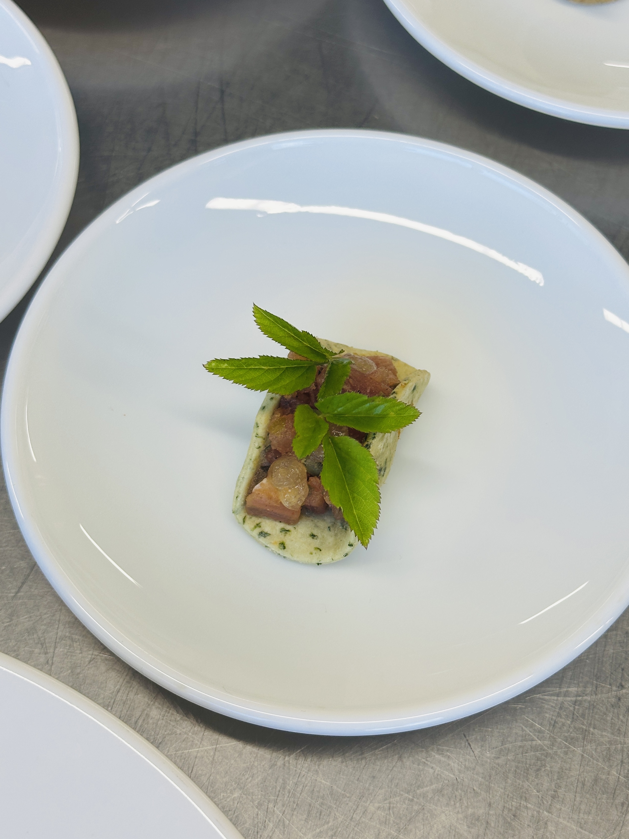 Järgmiseks käigu nimeks sai “rohi on juba rohelisem”. Pakkusime rohelise herne kreemsuppi toortatrakrõpsu ja lesthernega. Sinna kõrvale tegime ürdise kukli, millest tähelepanelikud külalised tundsid ära jänku. Väikeseks vahepalaks esinesid teile meie koka eriala õpilased Hiie ja Kaur.