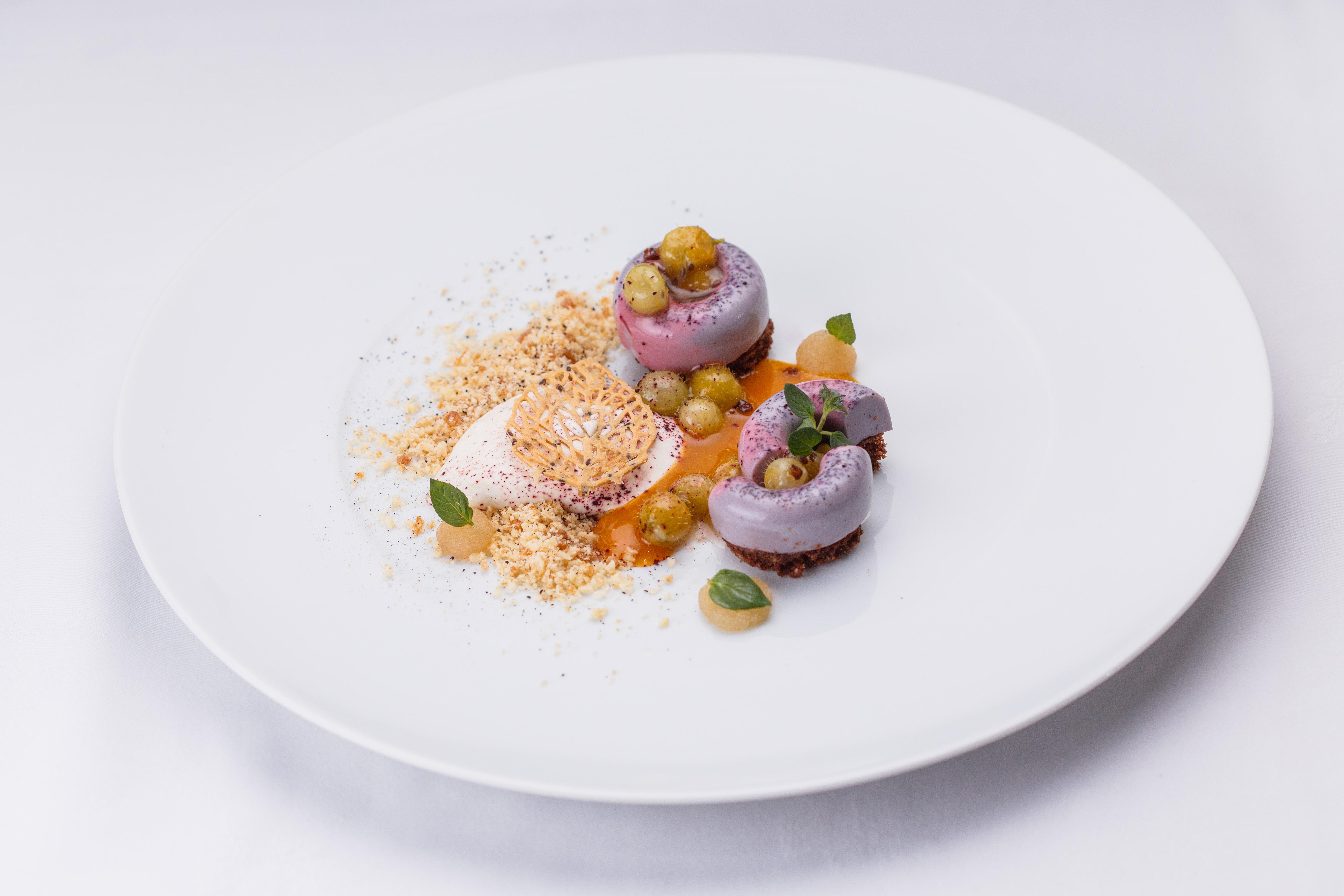 pähklipralinee, karusmarja-astelpaju kaste, karusmarjageel ja tuille.