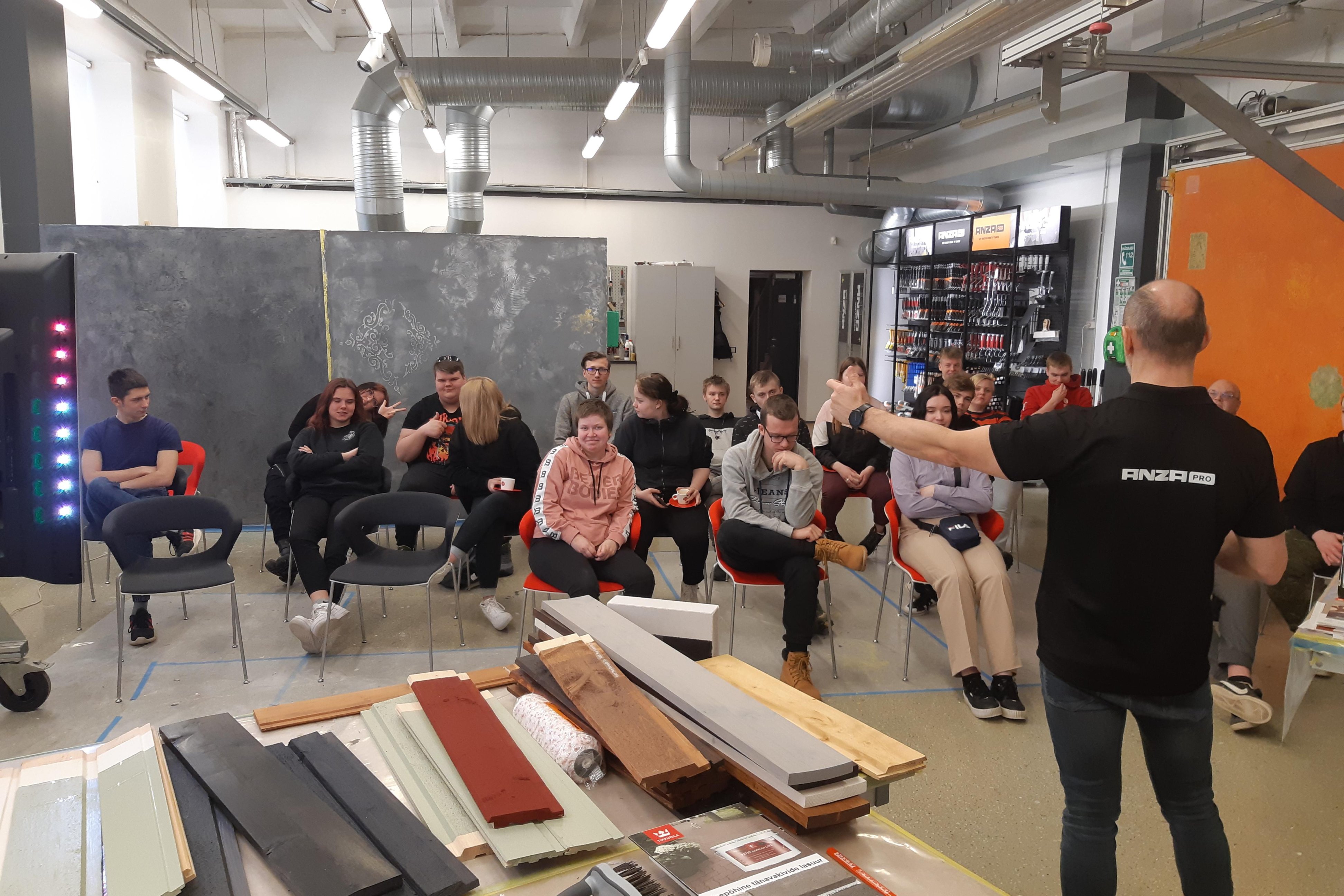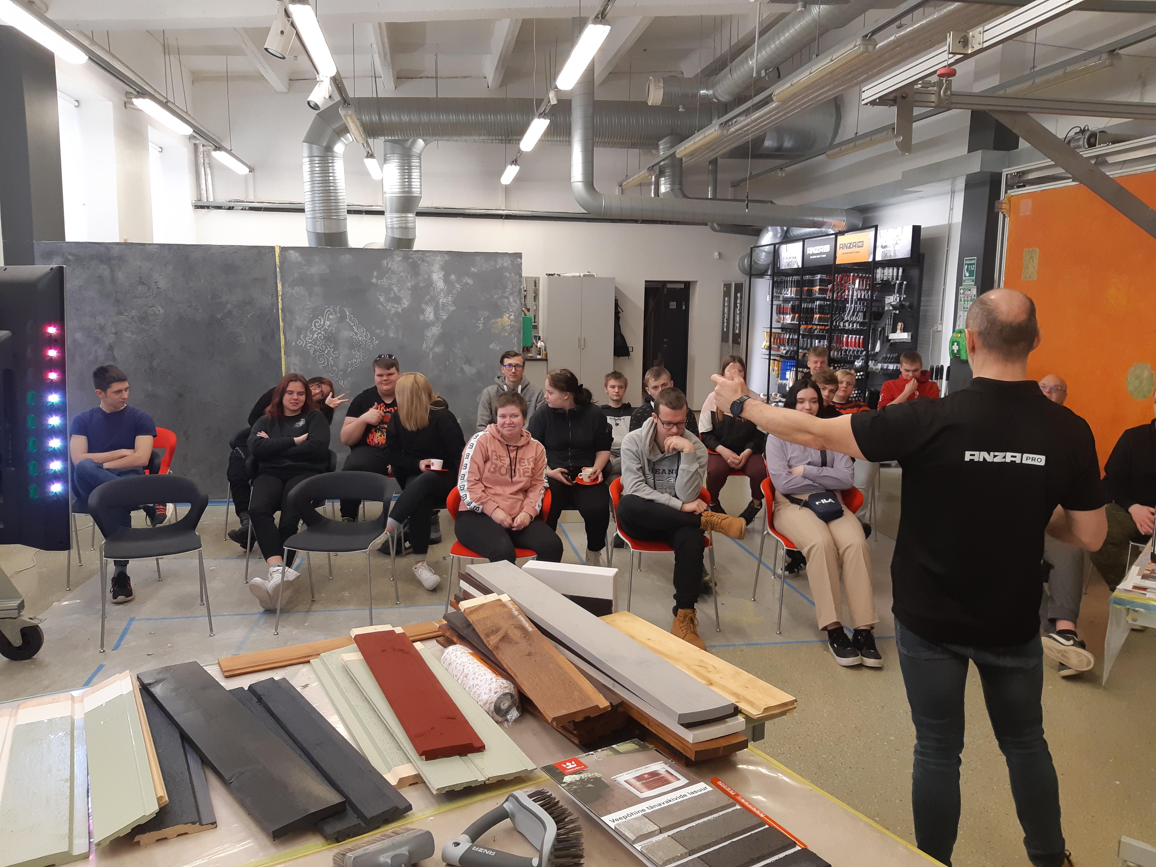 Esimene õppekäik toimus Tikkurila värvilaborisse, kus tutvustati tänapäeva värve ning nende kasutamist välisfassaadidel ja seintel. Uued lahendused on juba kasutusel - näiteks saab välisfassaadi värvida +2 kuni +30 kraadi juures (küll ei tohi sadada vihma, lund või olla väga päikeseline). Tehti ka näitlikustamine krohvitud välisseinal, kui õues oli +5 kraadi. Värvid on oma olemuselt nii eriliseks loodud, et neid on võimalik kasutada väga erinevates kohtades ja tingimustes. Tulemuseks on korralik värvitud pind. Veel tutvustati puidu töötlemise vahendeid välitingimustes: immutusvahendid, lasuurid, välisvoodrilaua ja teiste pindade eritoonides värvid. Suur tähtsus on ka töövahenditel, et töö oleks kvaliteetne ja lihtne teostada, selleks on Tikkurila ametlik ANZA maalritööriistade maaletooja ja müüa. Koolituspäev oli väga õpetlik ning värvimaailmas uute materjalidega tutvumine silmaringi avardav kogemus.