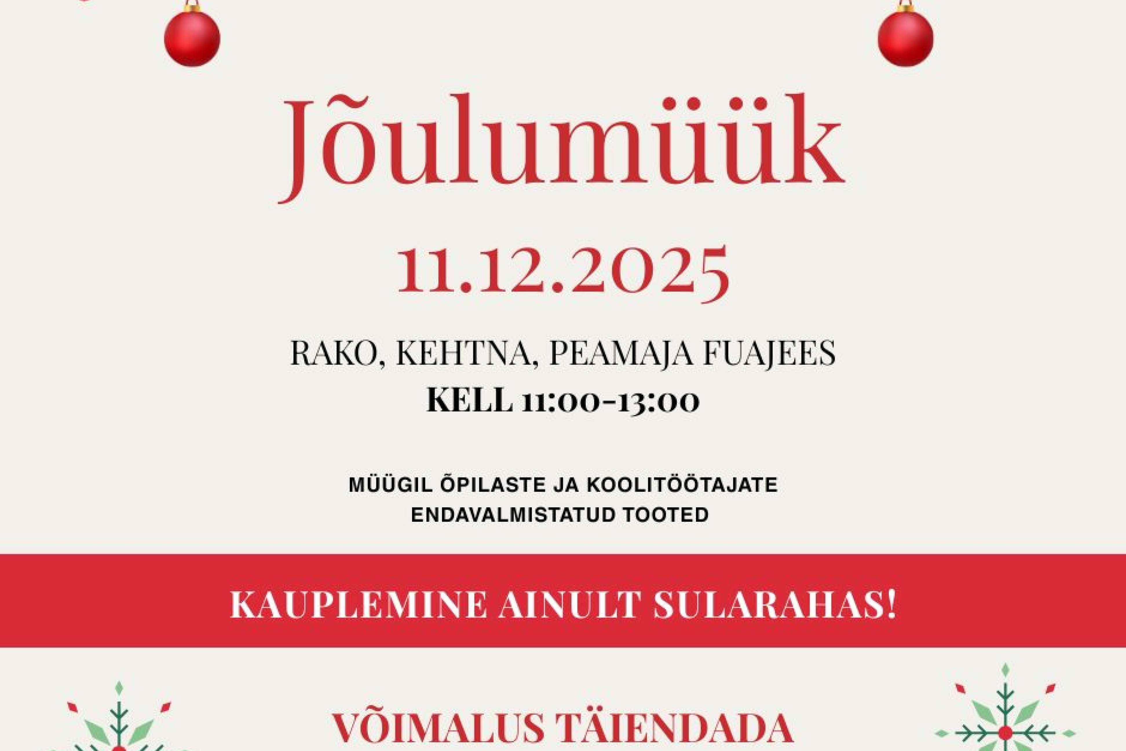 Sel neljapäeval, 11. detsembril toimub Raplamaa Rakenduslikus Kolledžis Kehtna õppekohas mõnus jõulumüük-laadapäev, kus on müügil meie oma õpilaste ja õpetajate valmistatud tooted. Kauplemine käib peamaja fuajees. Tule ka Sina, sest nii saad oma kingikotti vahvate leidudega täiendada!