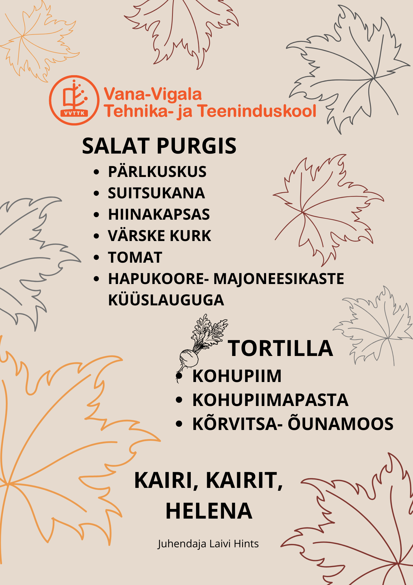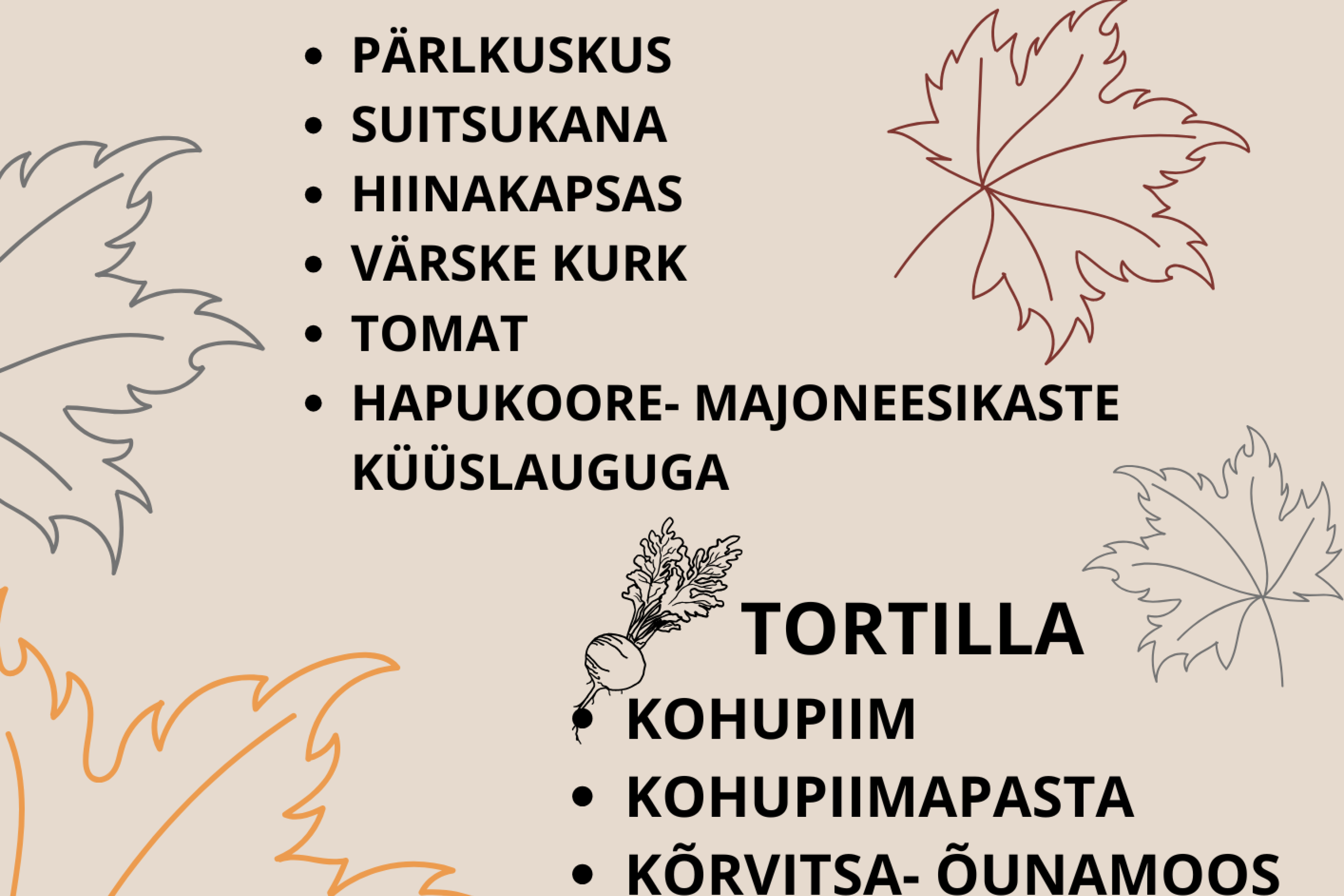 Meie kooli esindas 3 köögiabilist: Kairi ja Kairit 2. kursuselt ja Helena 1. kursuselt. Õpilasi juhendas toitlustusosakonna kutseõpetaja Laivi Hints. Soolaseks ampsuks pakuti kihilist salatit, mis serveeriti purgis. Magusaks suupisteks oli kohupiima ja kõrvitsa-õunamoosiga täidetud tortilla, mis on hea kaasa haarata taaskasutust vajavas tühjas mahlapakis.