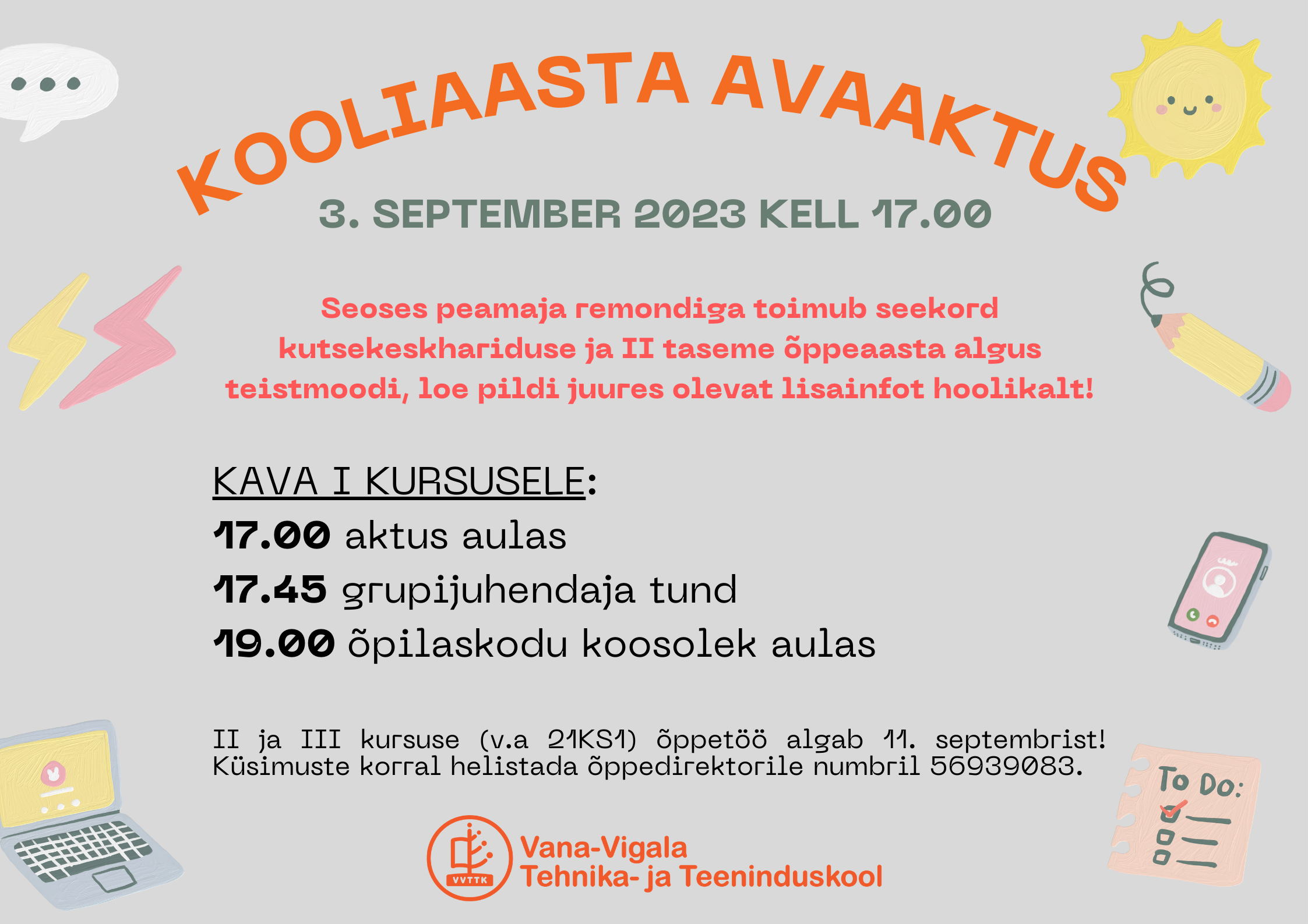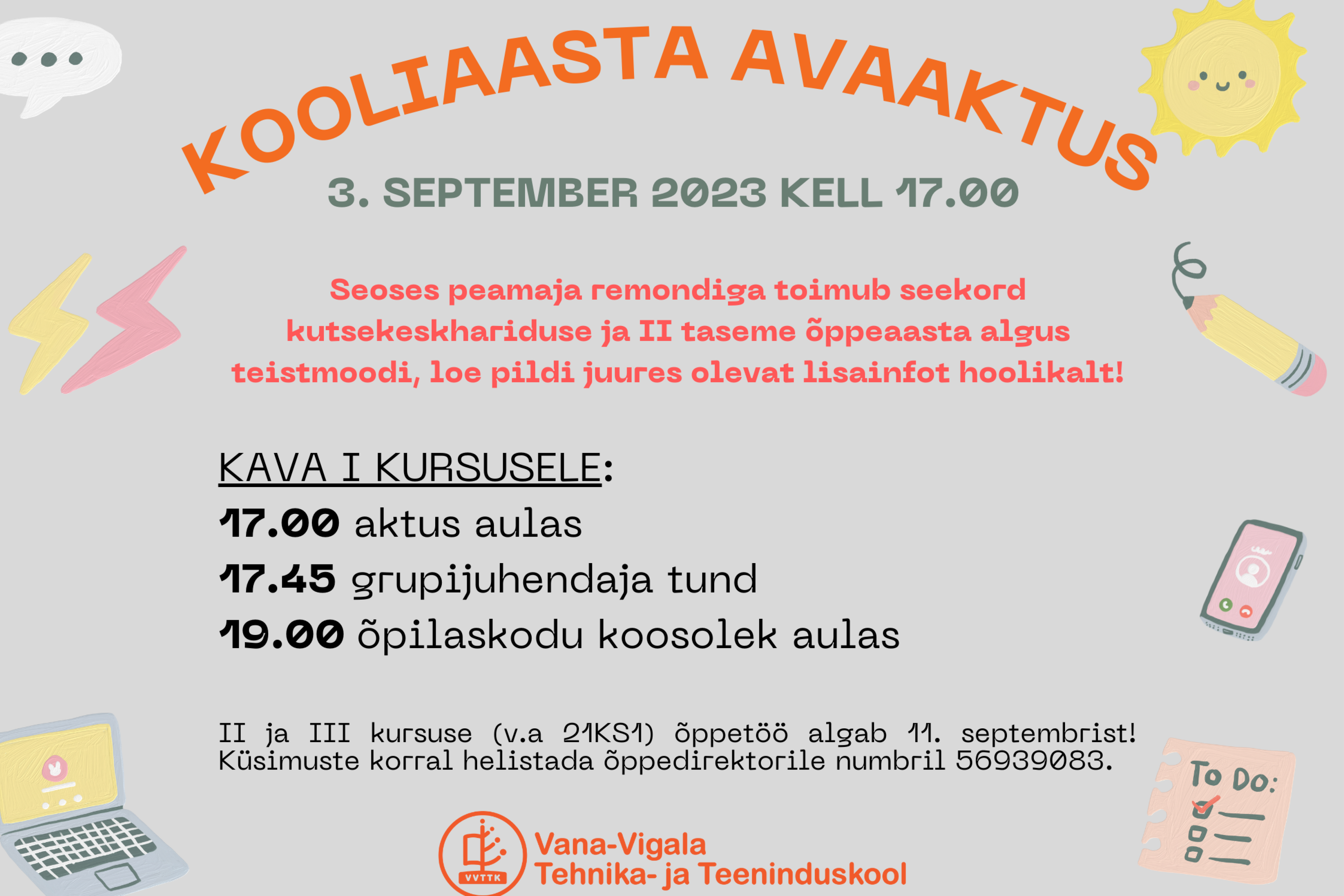 - I kursuse (väljaarvatud kokad ja abikokad) õppetöö algab 4. septembril kell 8.30. Samuti algab õppetöö grupil 21KS1 ja II taseme õpilastel (täpsem info tugikeskuse juhatajalt Liina Kikaselt numbril 5184152). Õpilaskodusse saab majutuda 3. septembril alates kell 15.00. Palume meeles pidada, et kohalik pood on pühapäeviti avatud kuni kell 17.00.