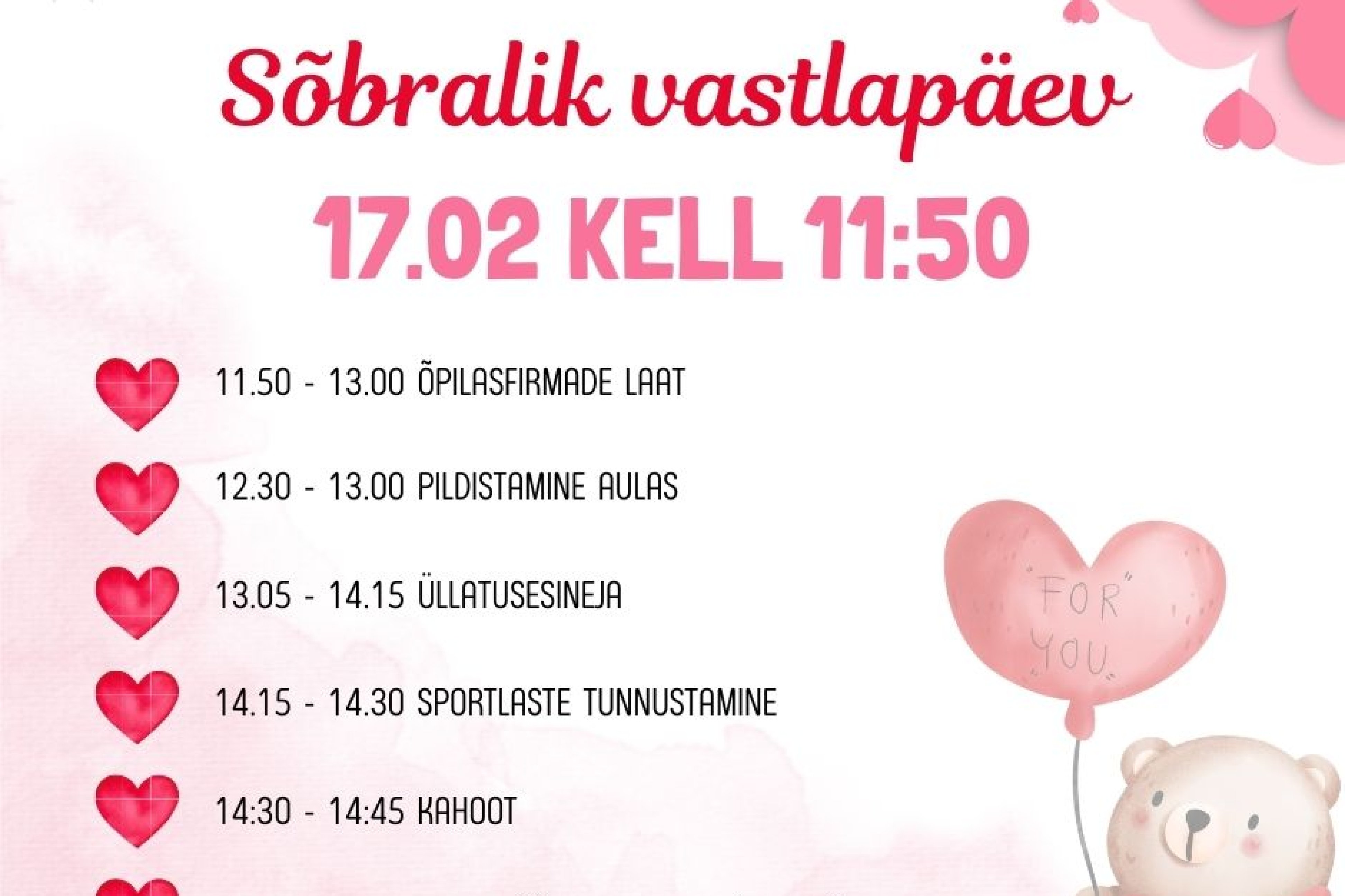 Hea õpilane ja õpetaja! Saame 17. veebruaril kell 11:50 peamajas kokku, et veeta koos üks rõõmus ja sõbralik päev täis tegevusi: