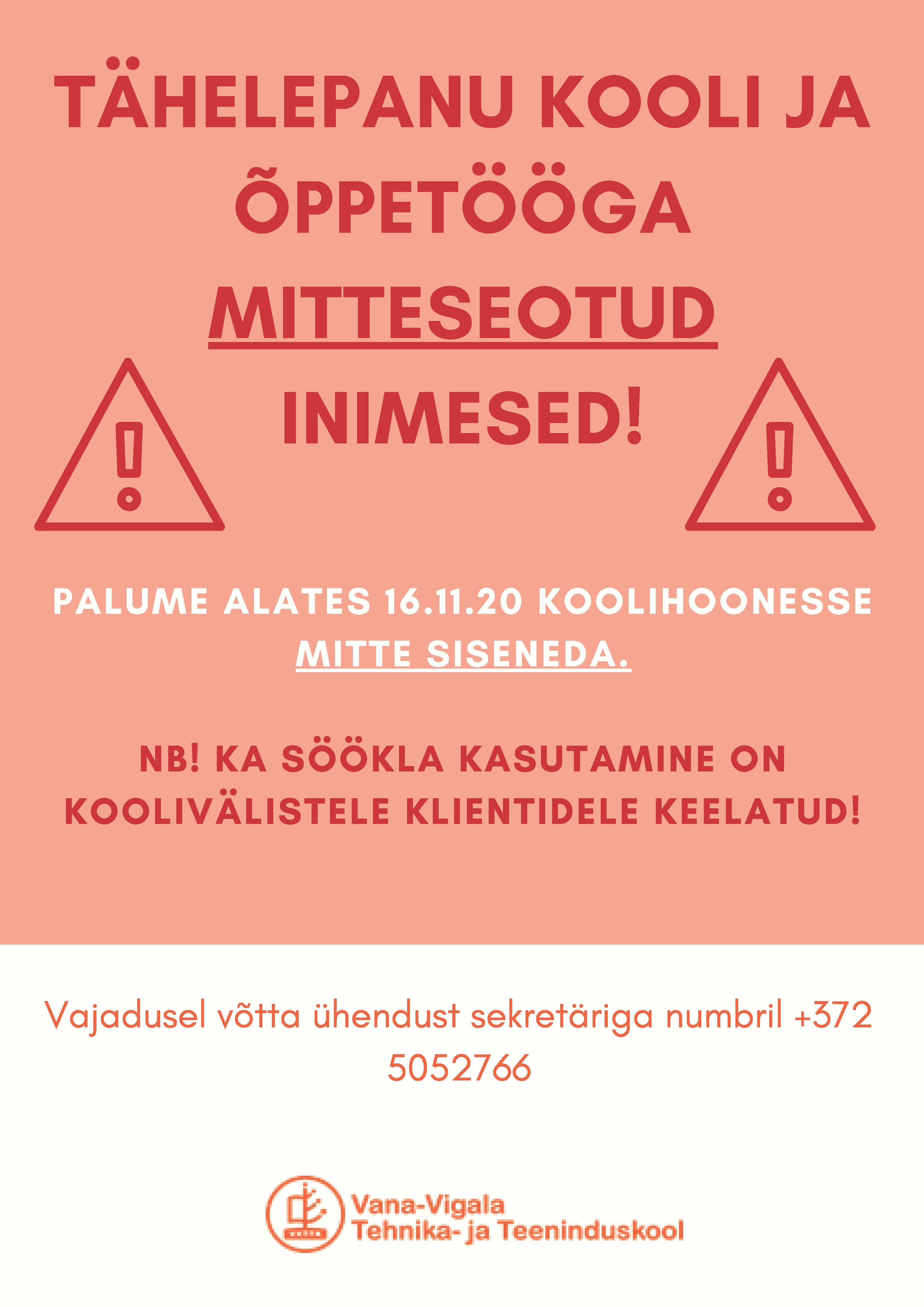 Seoses kõrge koroona riskiga palume õppetööga mitteseotud inimestel koolimajja mitte siseneda!