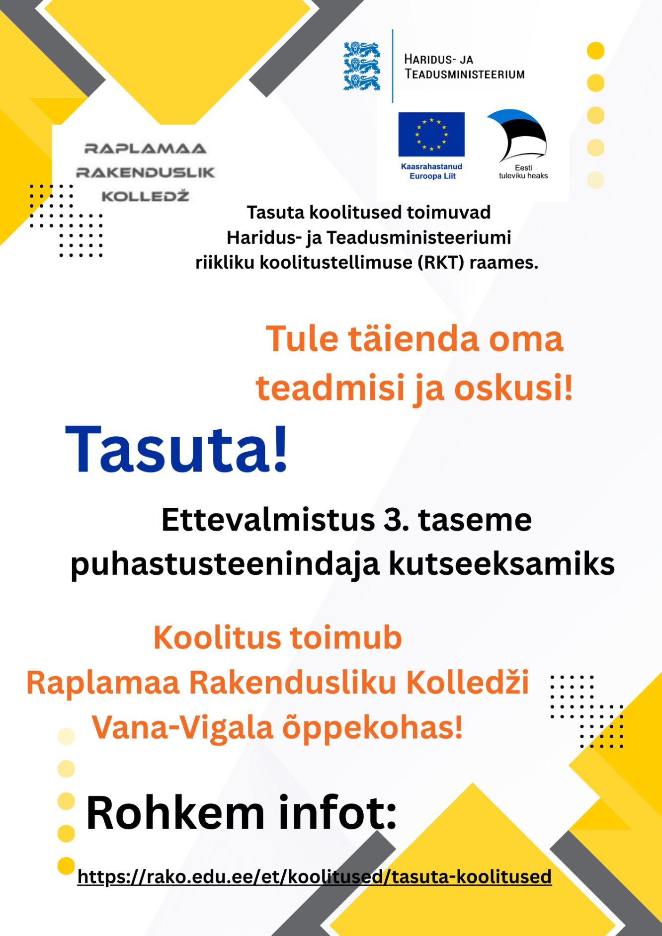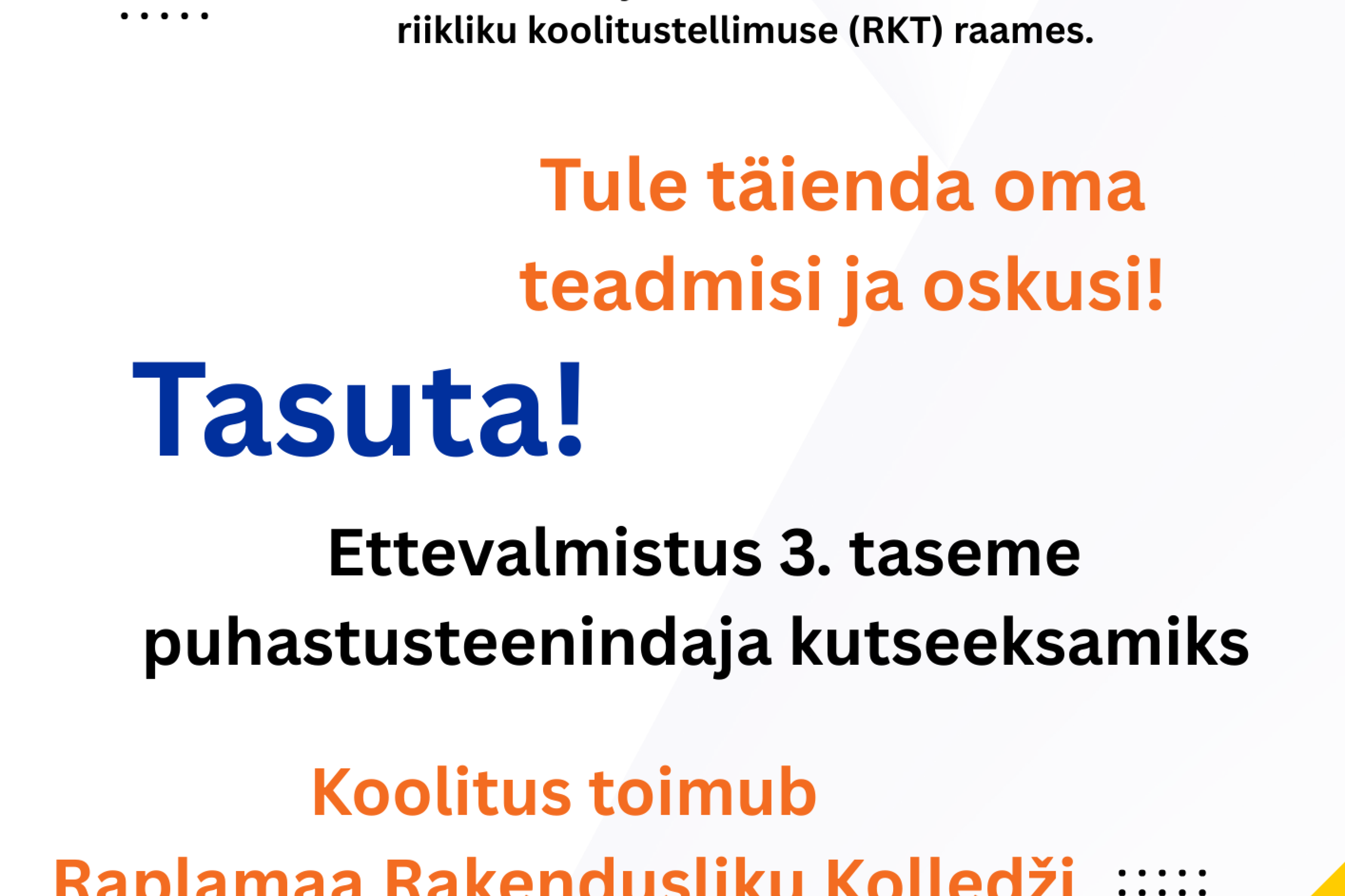Raplamaa Rakenduslikus Kolledžis, Vana-Vigala õppekohas toimub TASUTA koolitus "Ettevalmistus 3. taseme puhastusteenindaja kutseeksamiks".