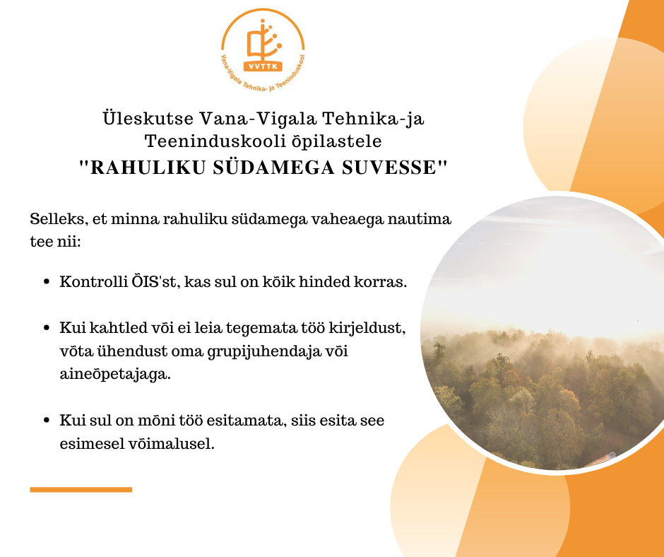 Õppeaasta lõpuni on jäänud vaid loetud nädalad ning Vana-Vigala Tehnika-ja Teeninduskool jätkab ⭐️ vaheajani ⭐️distantsõppes (v.a. lõpetavad kursused ja õpilased, kes on eraldi kooli juurde kutsutud). Selleks, et sa ei peaks kooli juurde järelvastamisele tulema ning saaksid rahulikult suve nautida, hoolitse selle eest, et kõik su hinded oleksid korras.