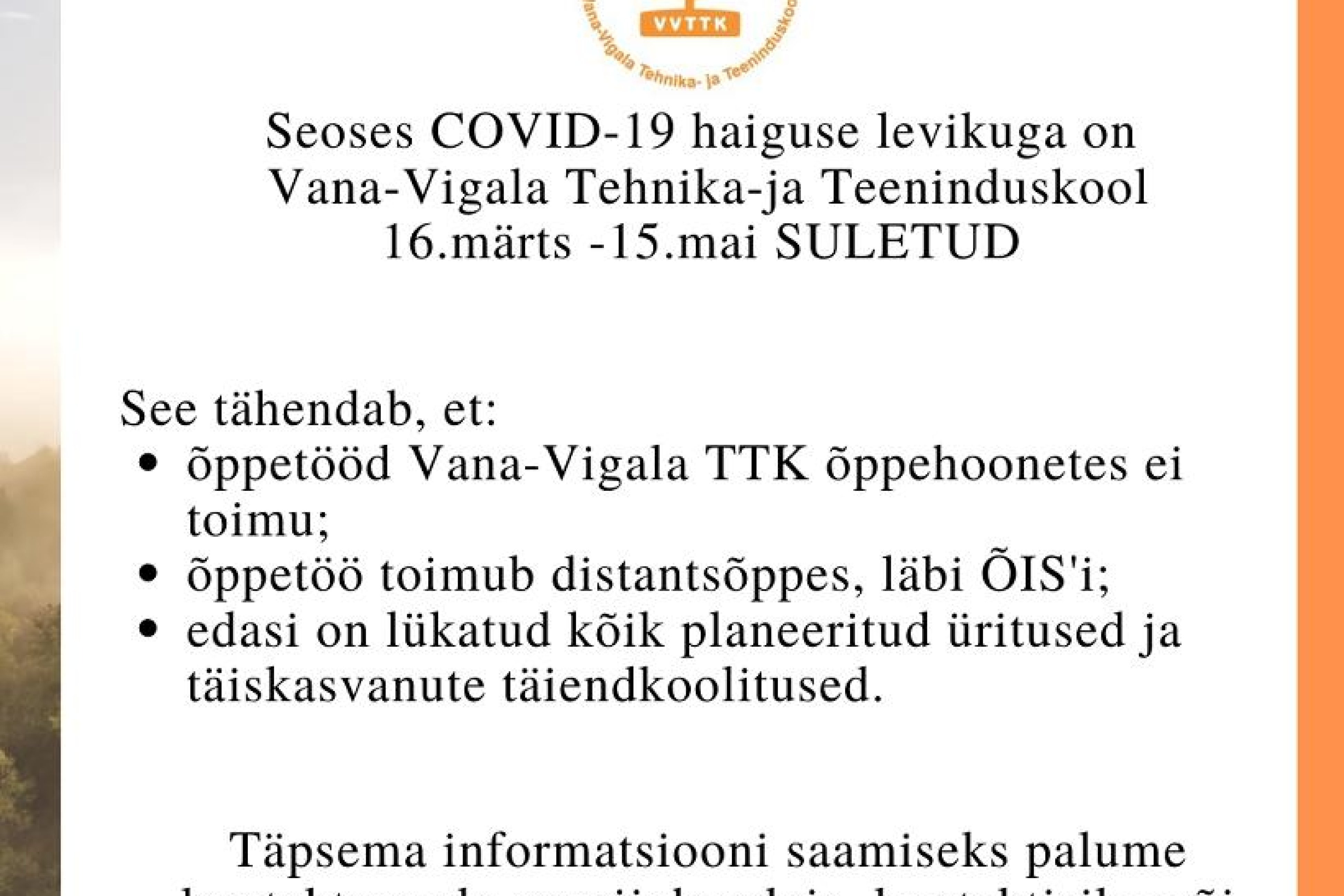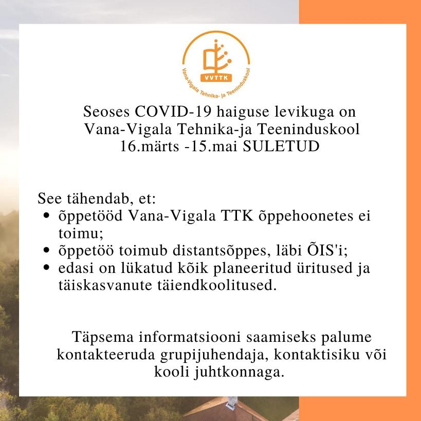 Seoses COVID-19 haiguse levikuga on Vana-Vigala Tehnika- ja Teeninduskool 16.märts - 15.mai suletud.